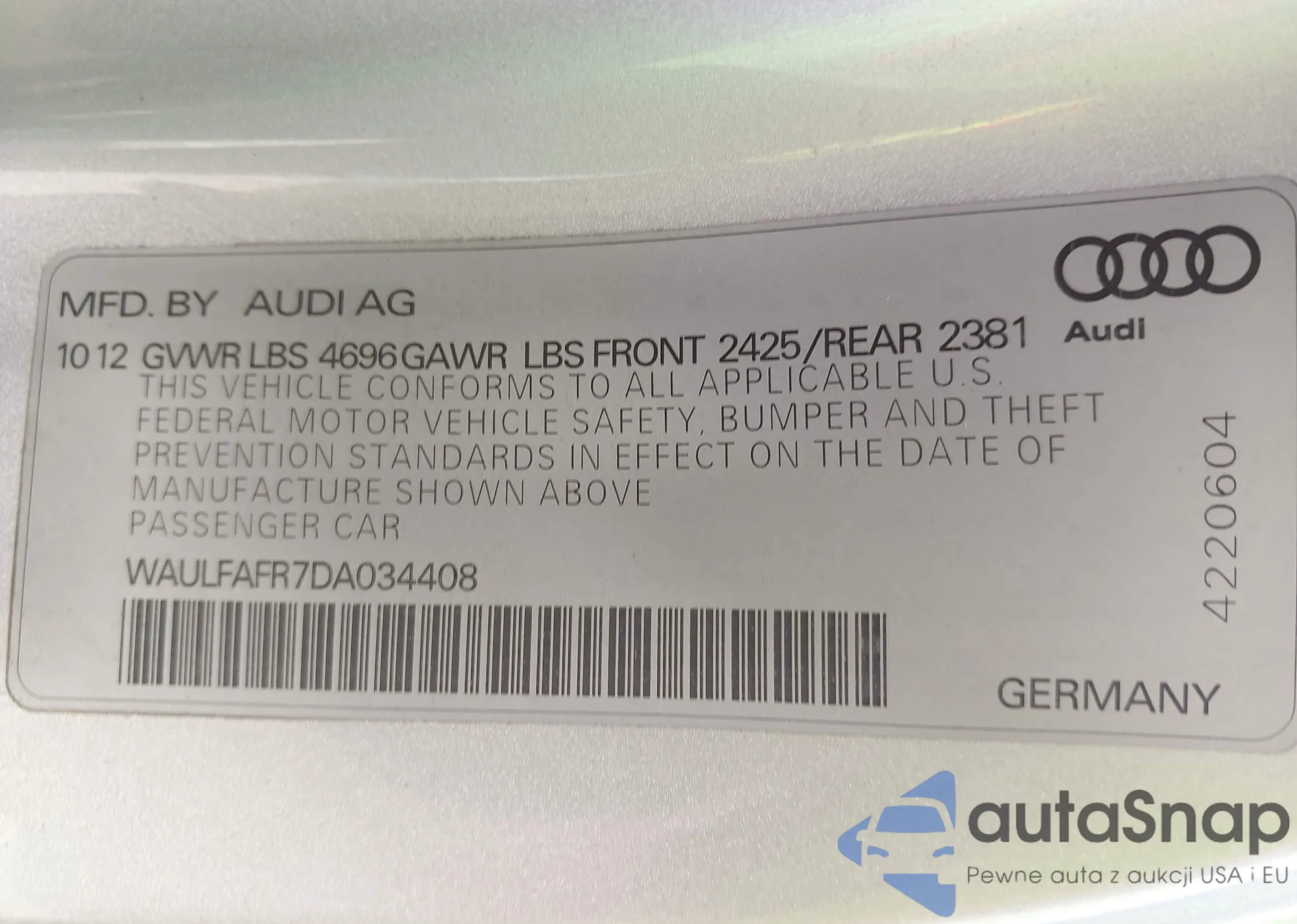 • VIN WAULFAFR7DA034408