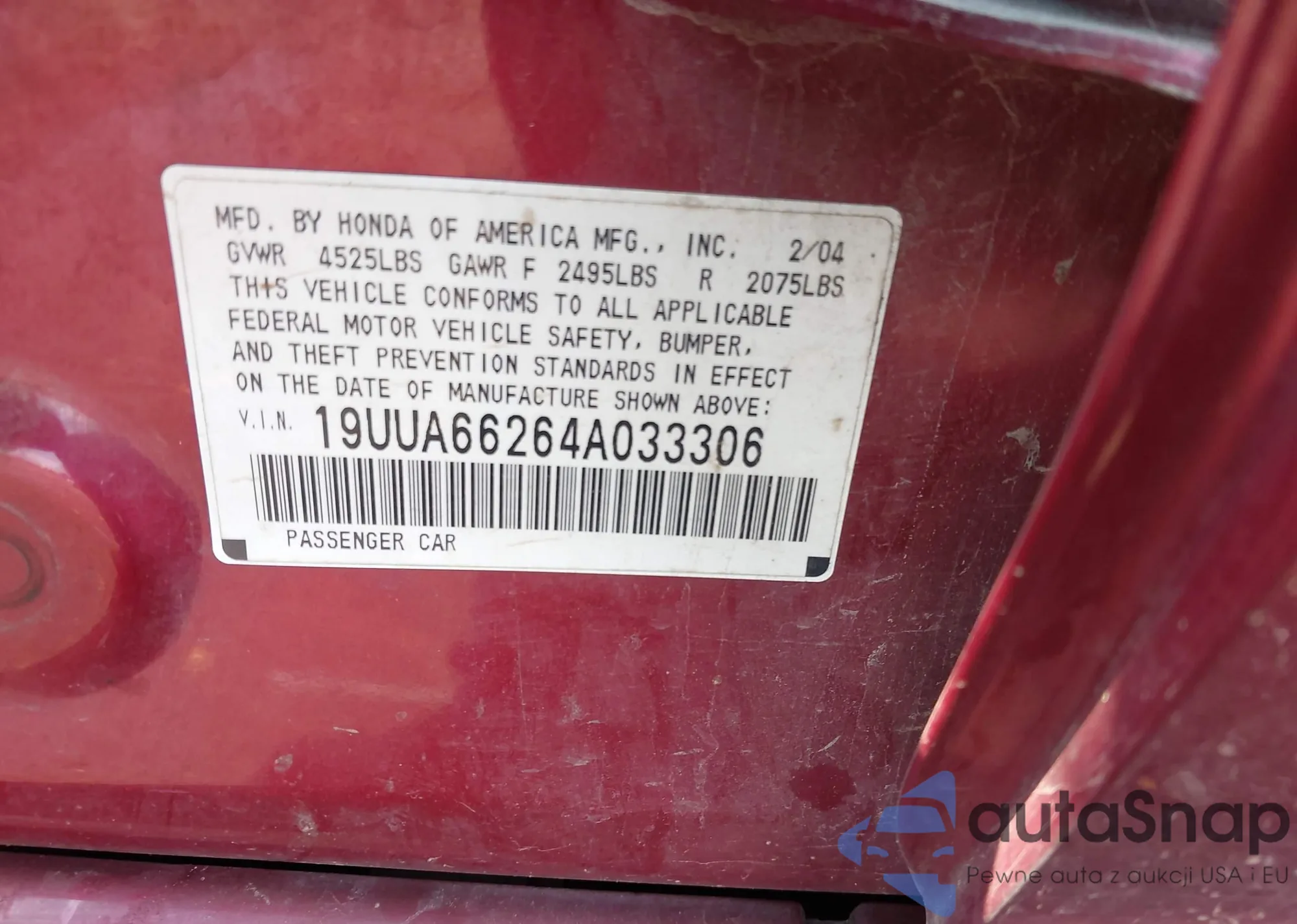 LOT: 42760160 VIN: 1HGCP2F39BA059357