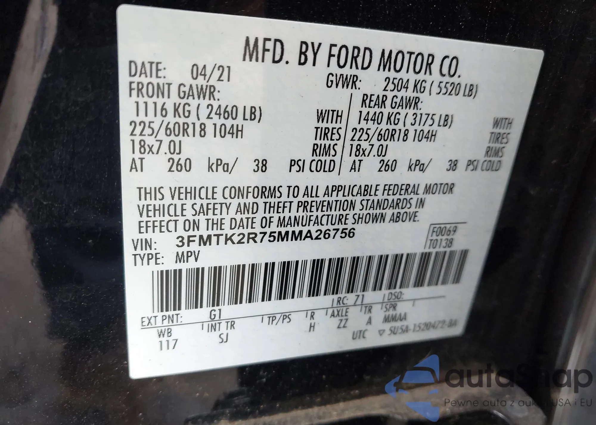LOT: 43448156 VIN: 3FMTK2R75MMA26756