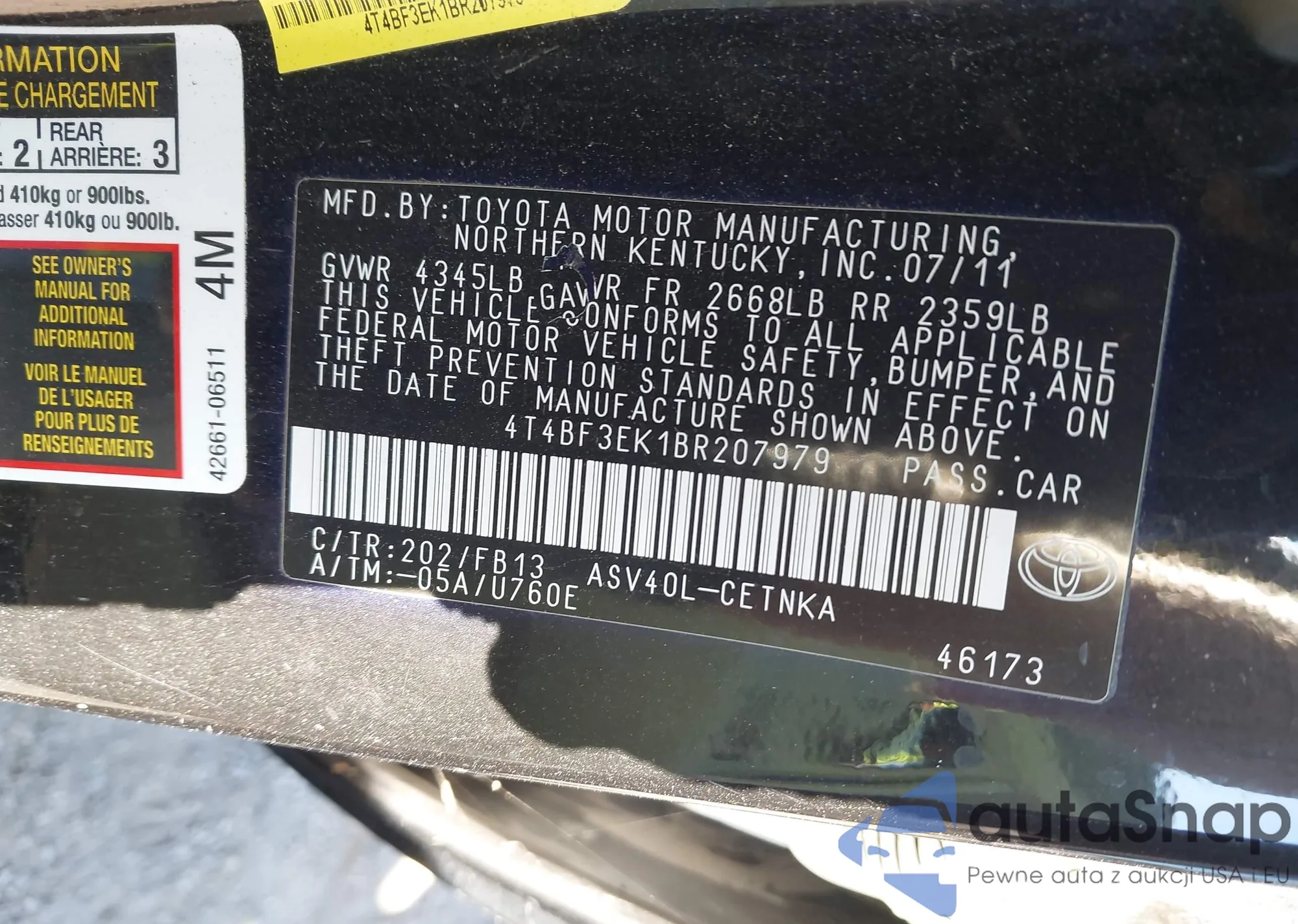 • VIN 4T4BF3EK1BR207979
