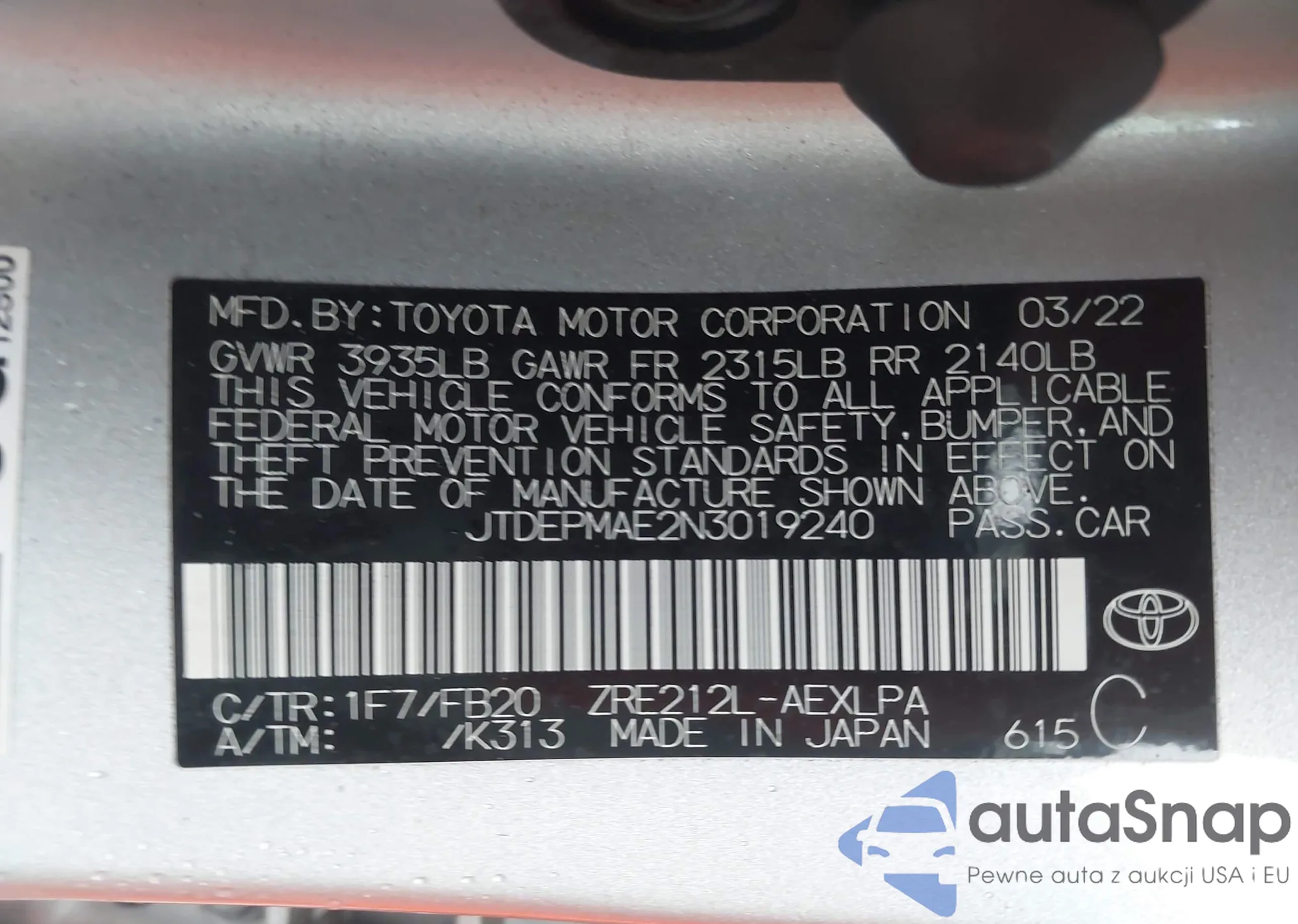 • VIN 4T1DBADK3SU004998