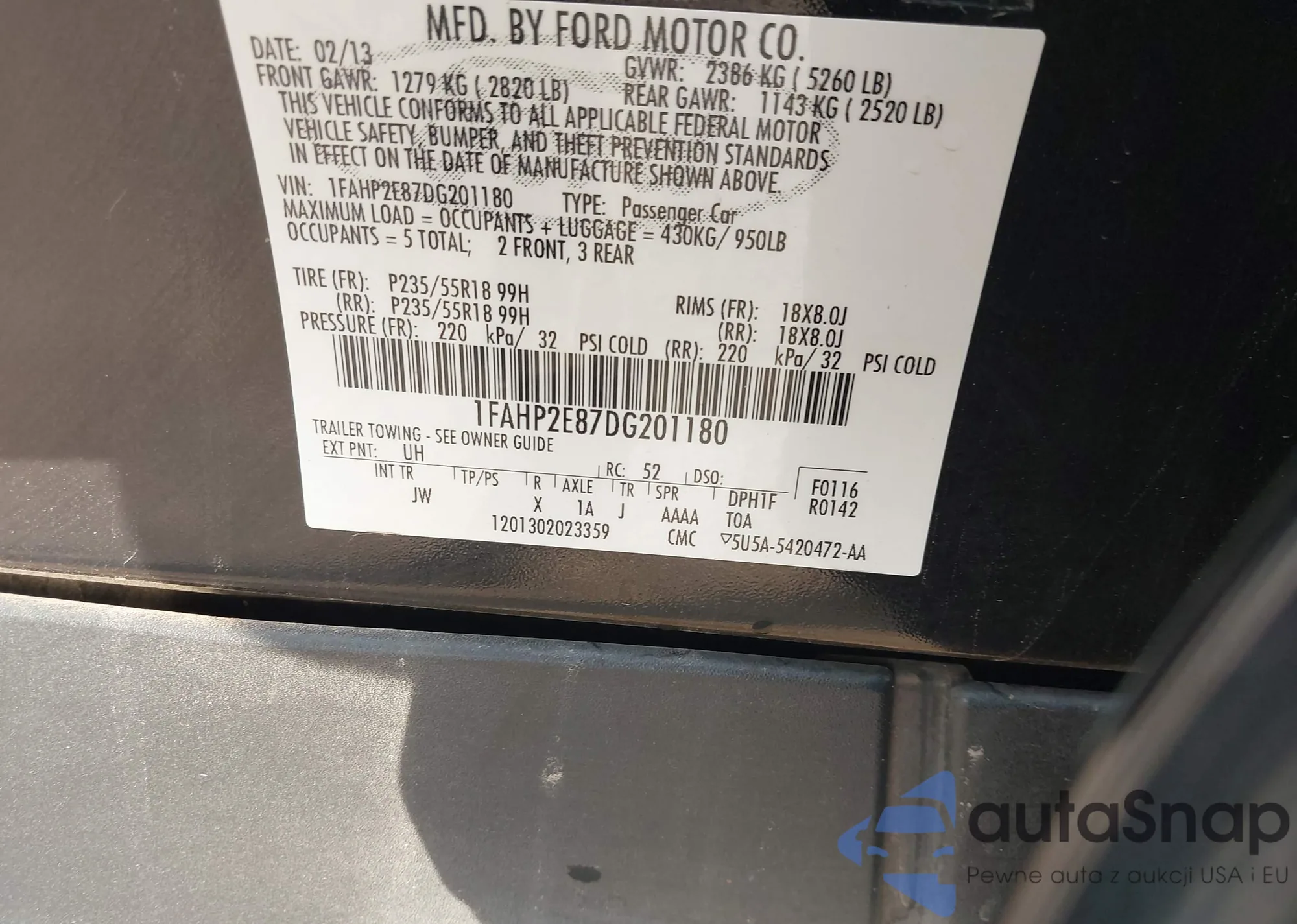 LOT: 43525695 VIN: 1FAHP2E87DG201180