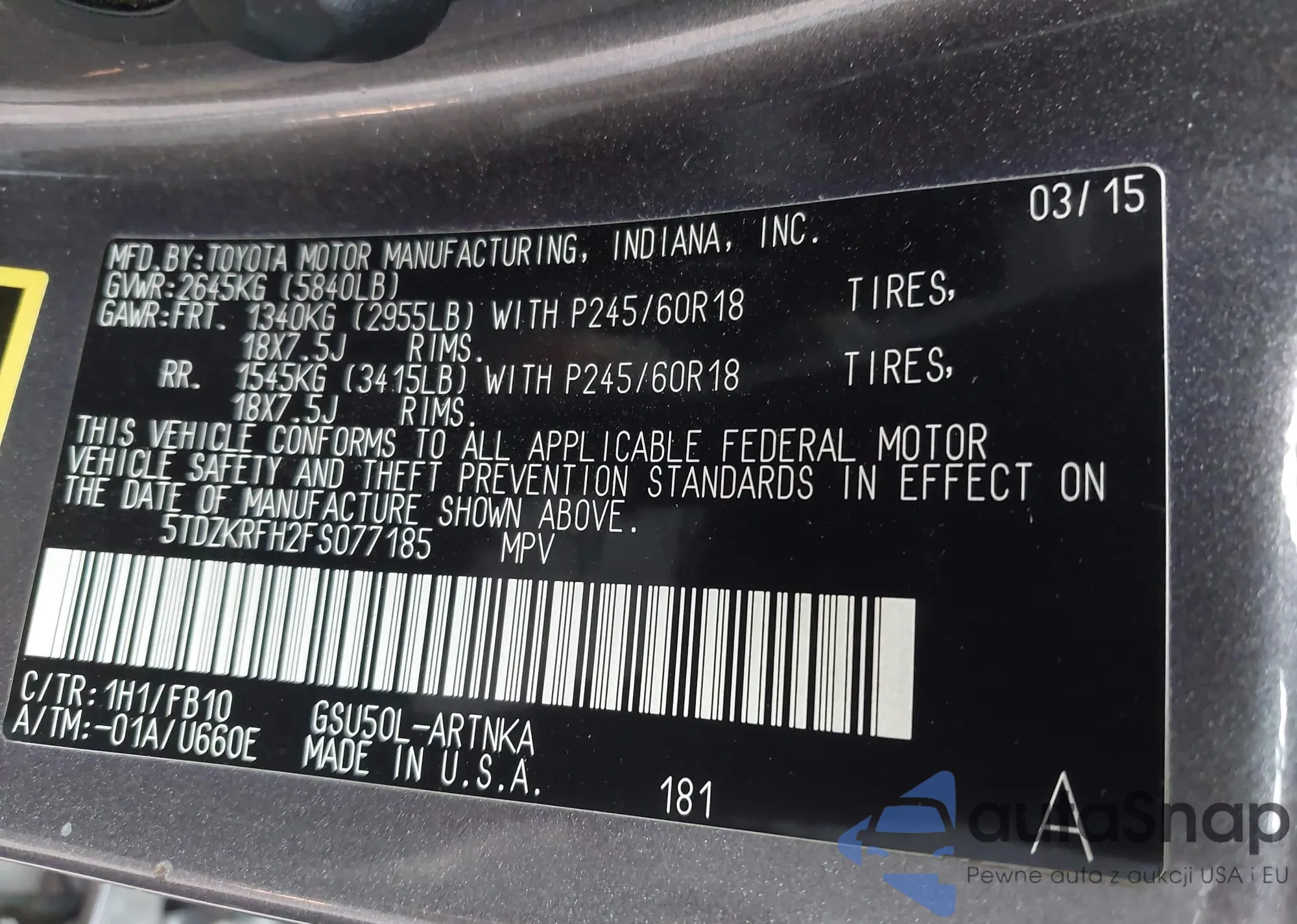 LOT: 43568937 VIN: 5TDZKRFH2FS077185