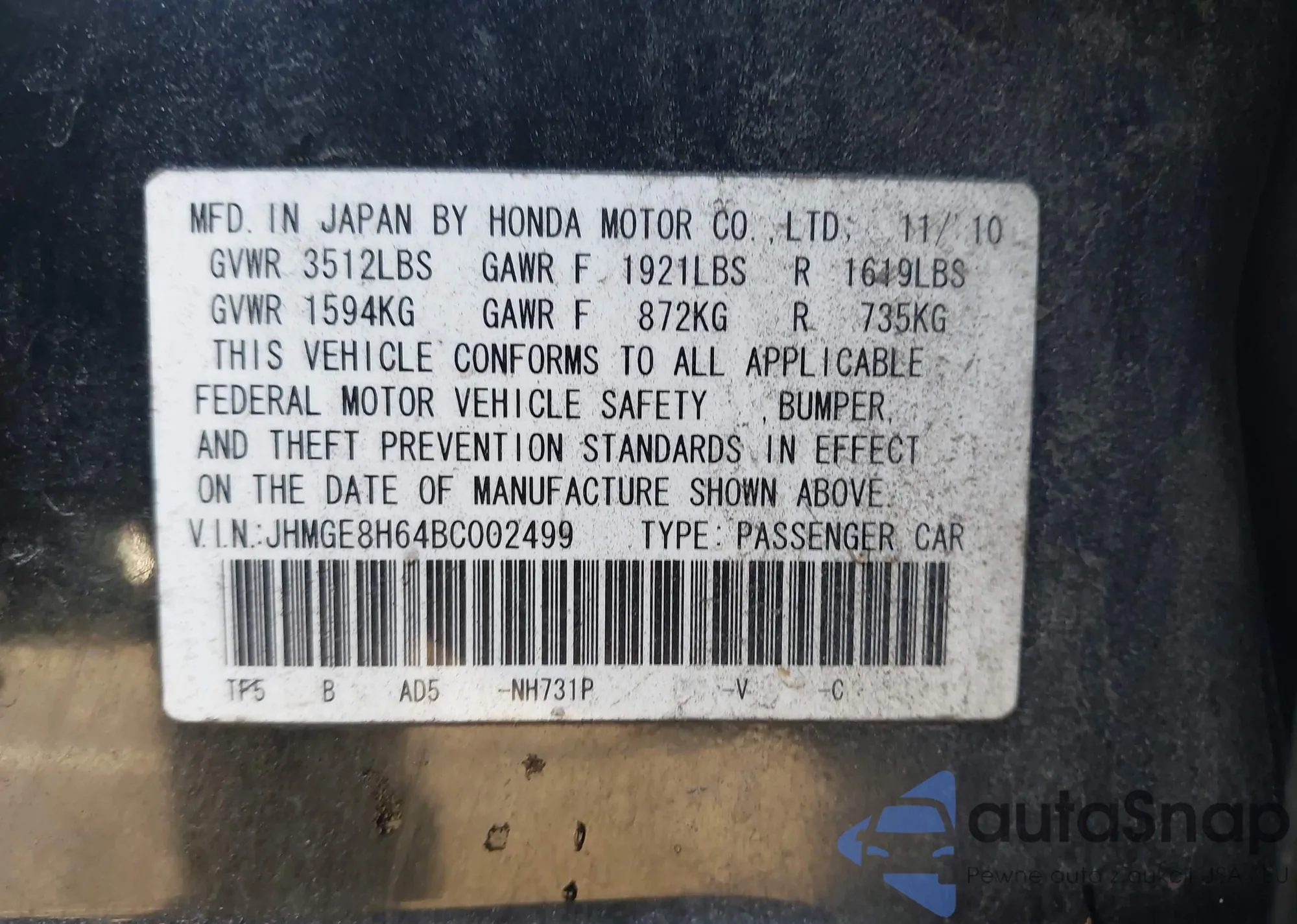 • VIN JHMGE8H64BC002499