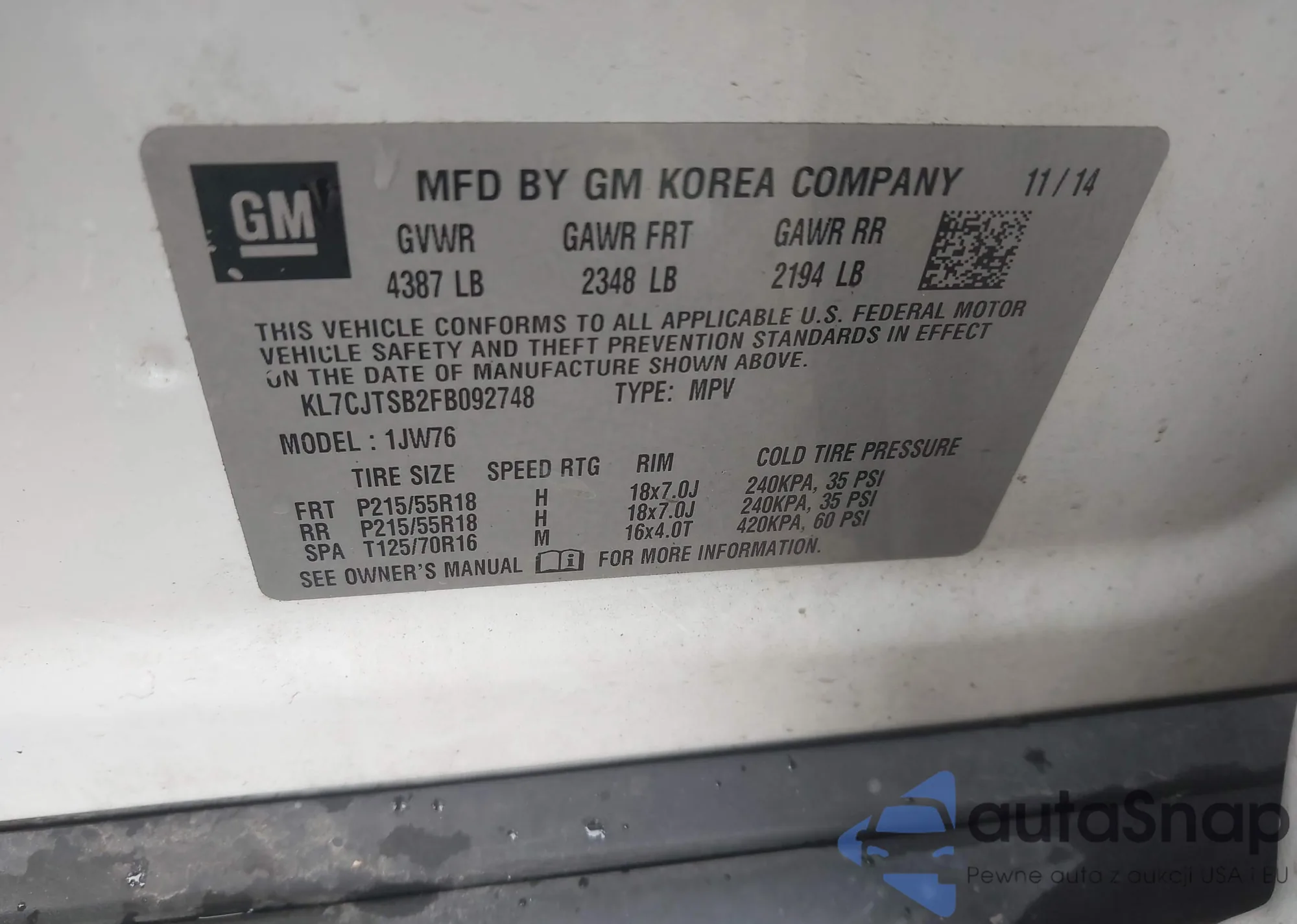 LOT: 43532302 VIN: KL7CJTSB2FB092748