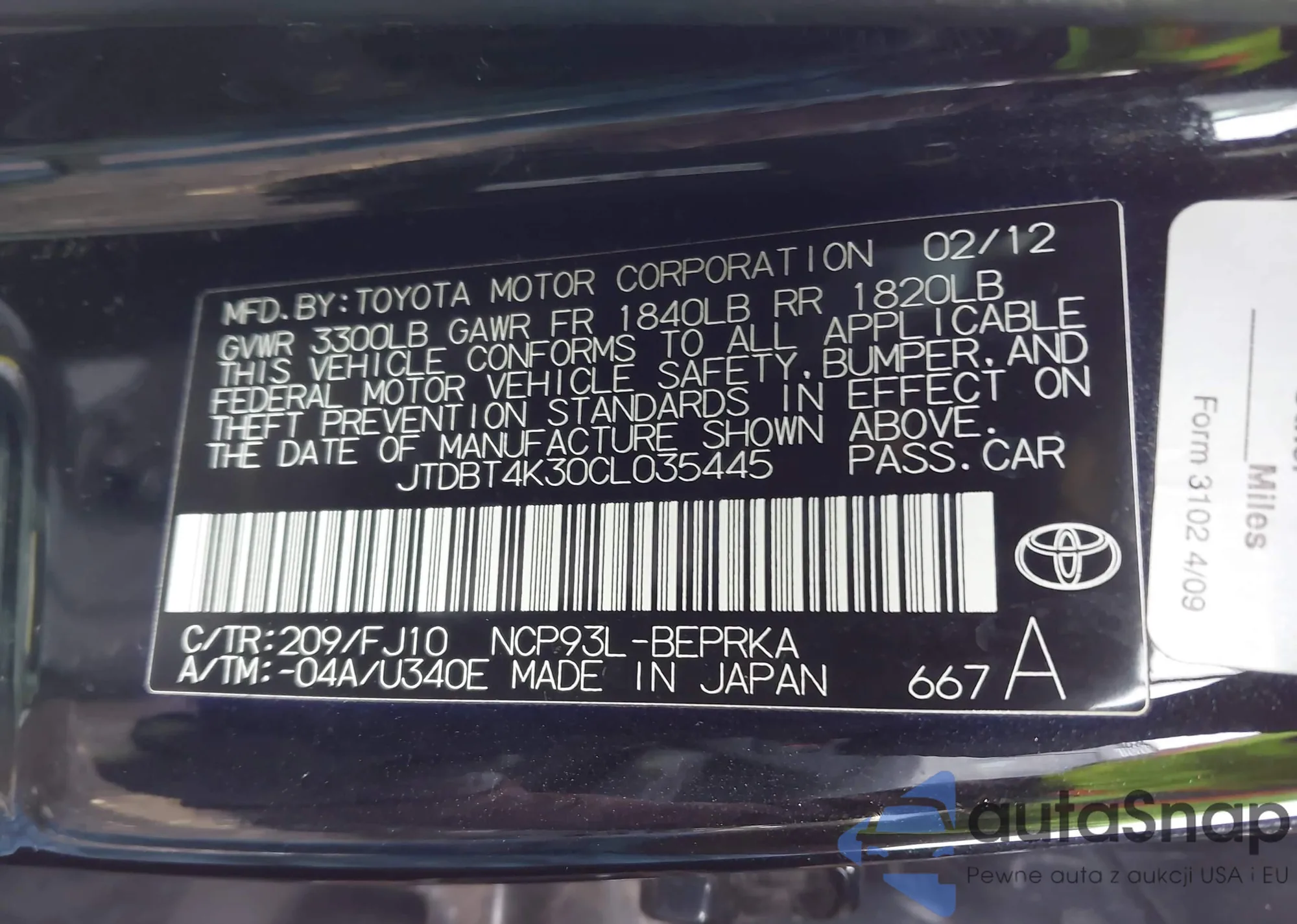 LOT: 43647551 VIN: JTDBT4K30CL035445