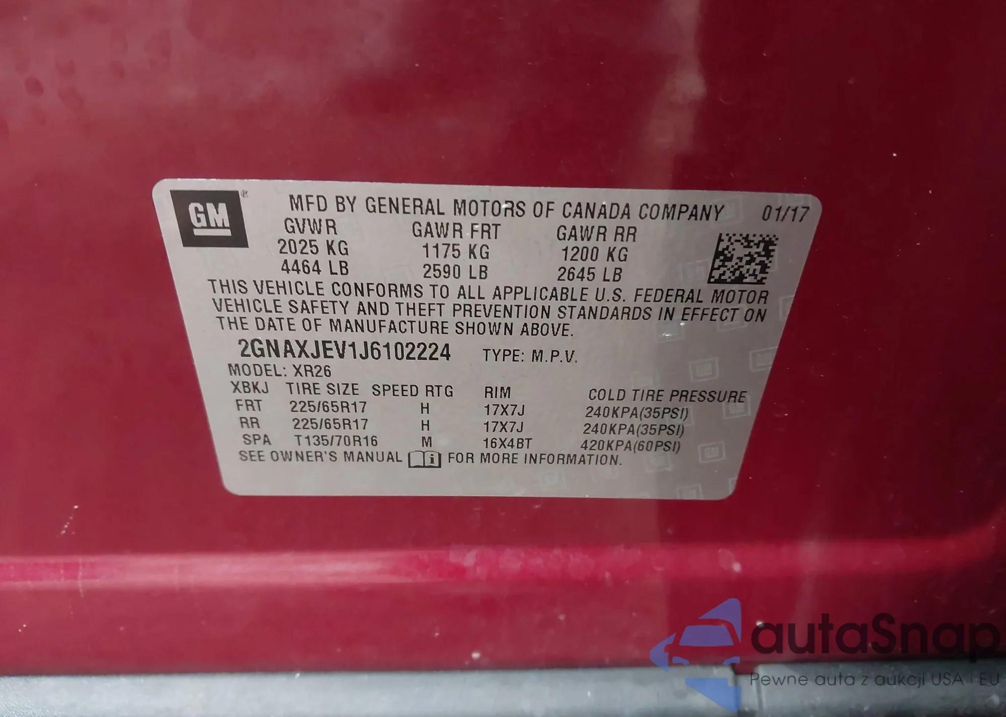 LOT: 43198927 VIN: 2GNAXJEV1J6102224
