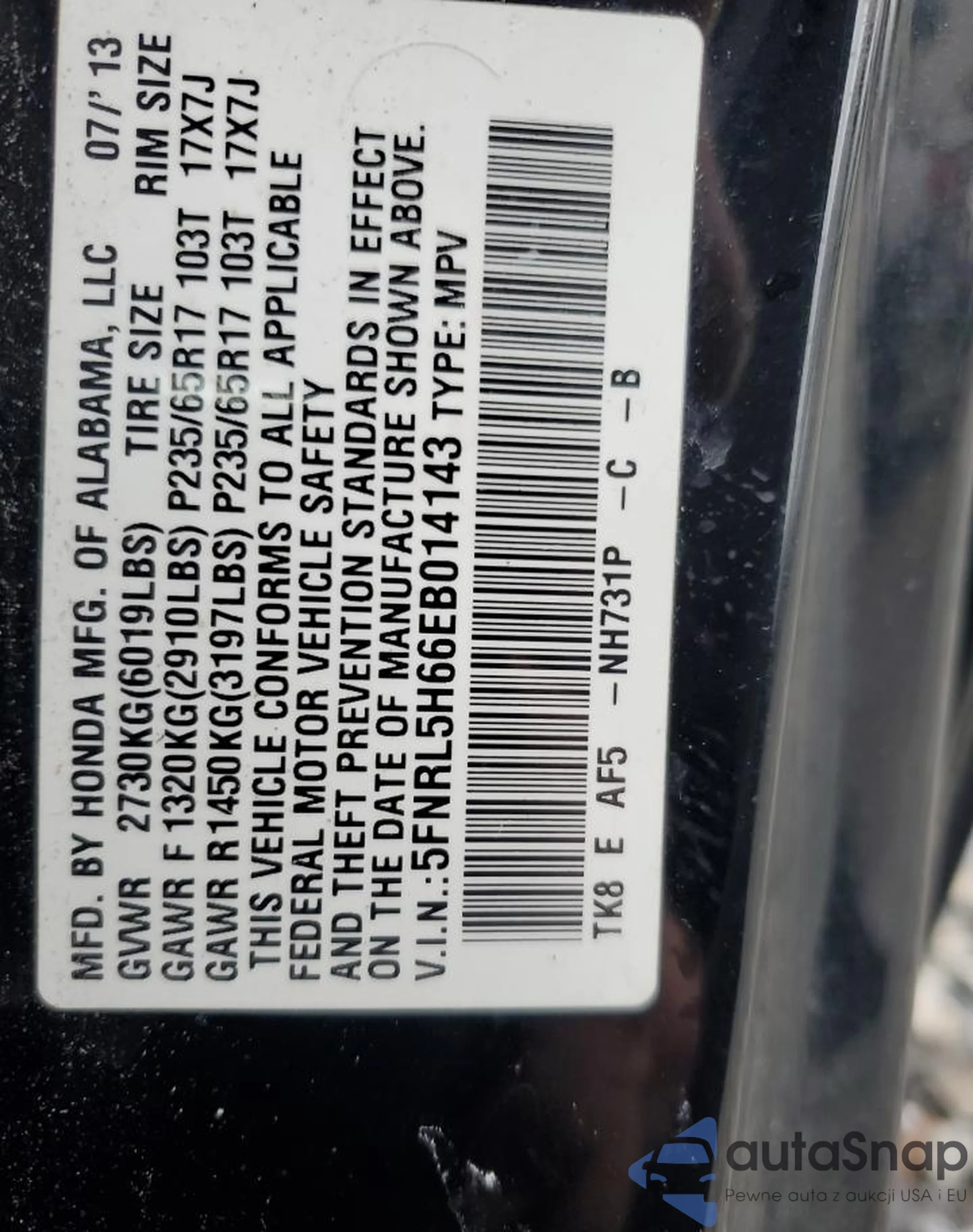 • VIN 5FNRL6H98SB061931