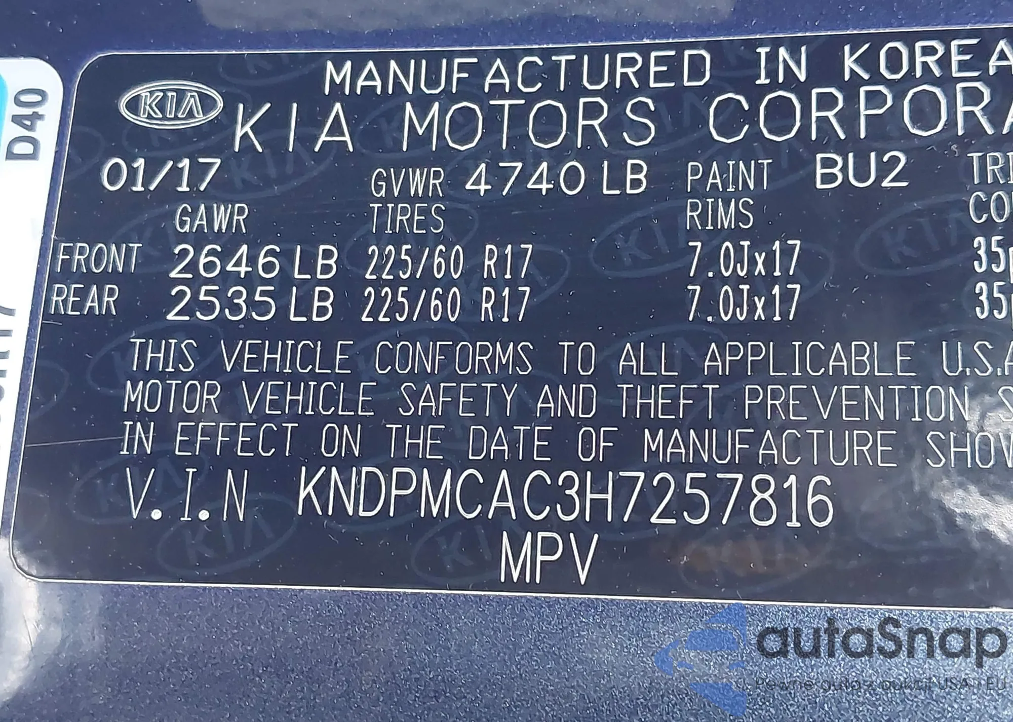 LOT: 42952874 VIN: KNDPMCAC3H7257816
