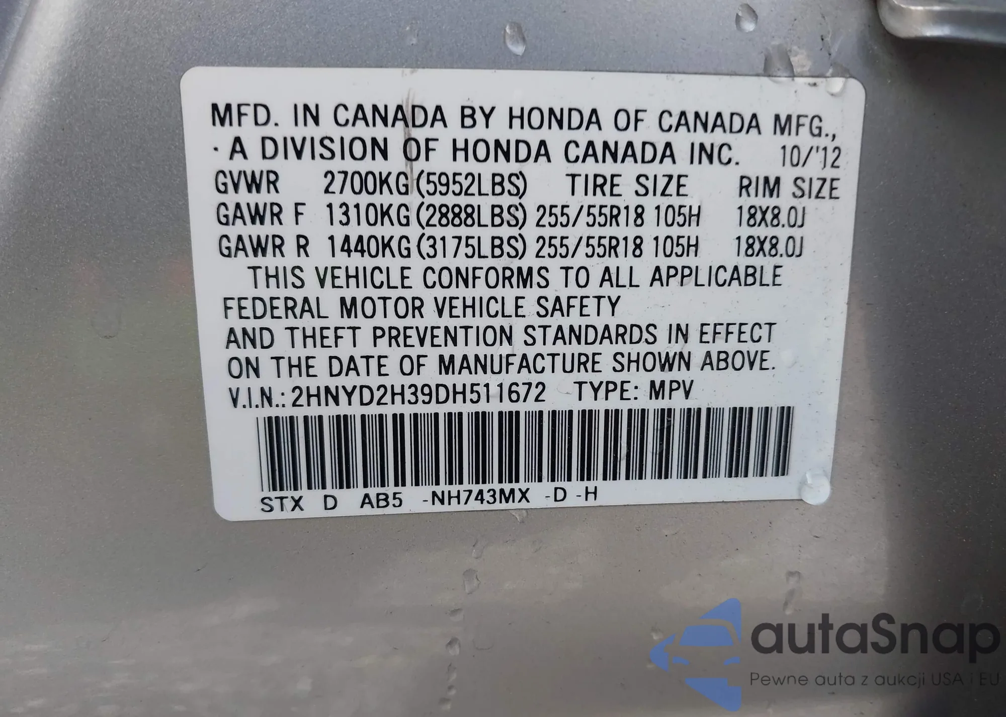 LOT: 43407829 VIN: 2HNYD2H39DH511672