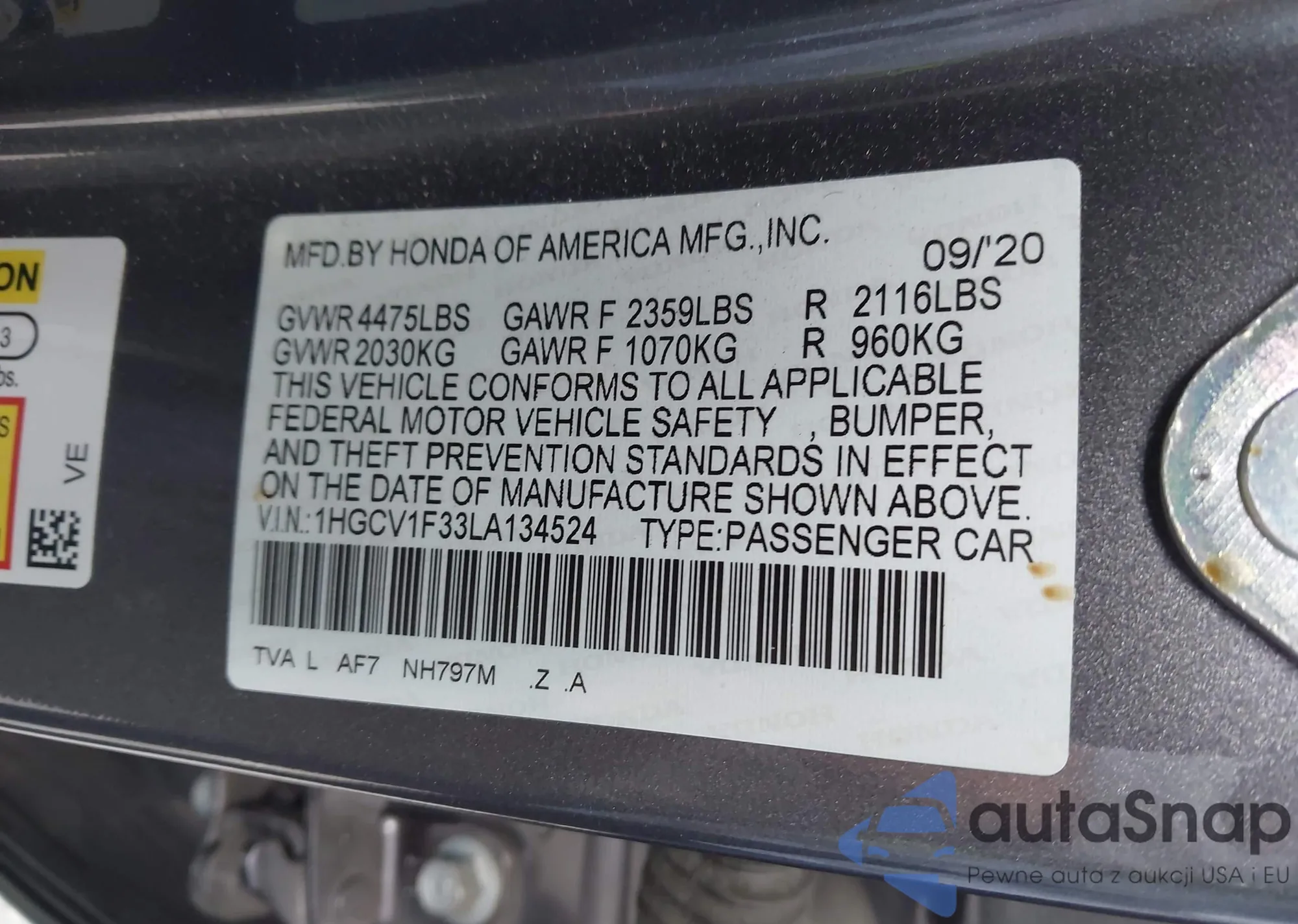• VIN 1HGCV1F33LA134524