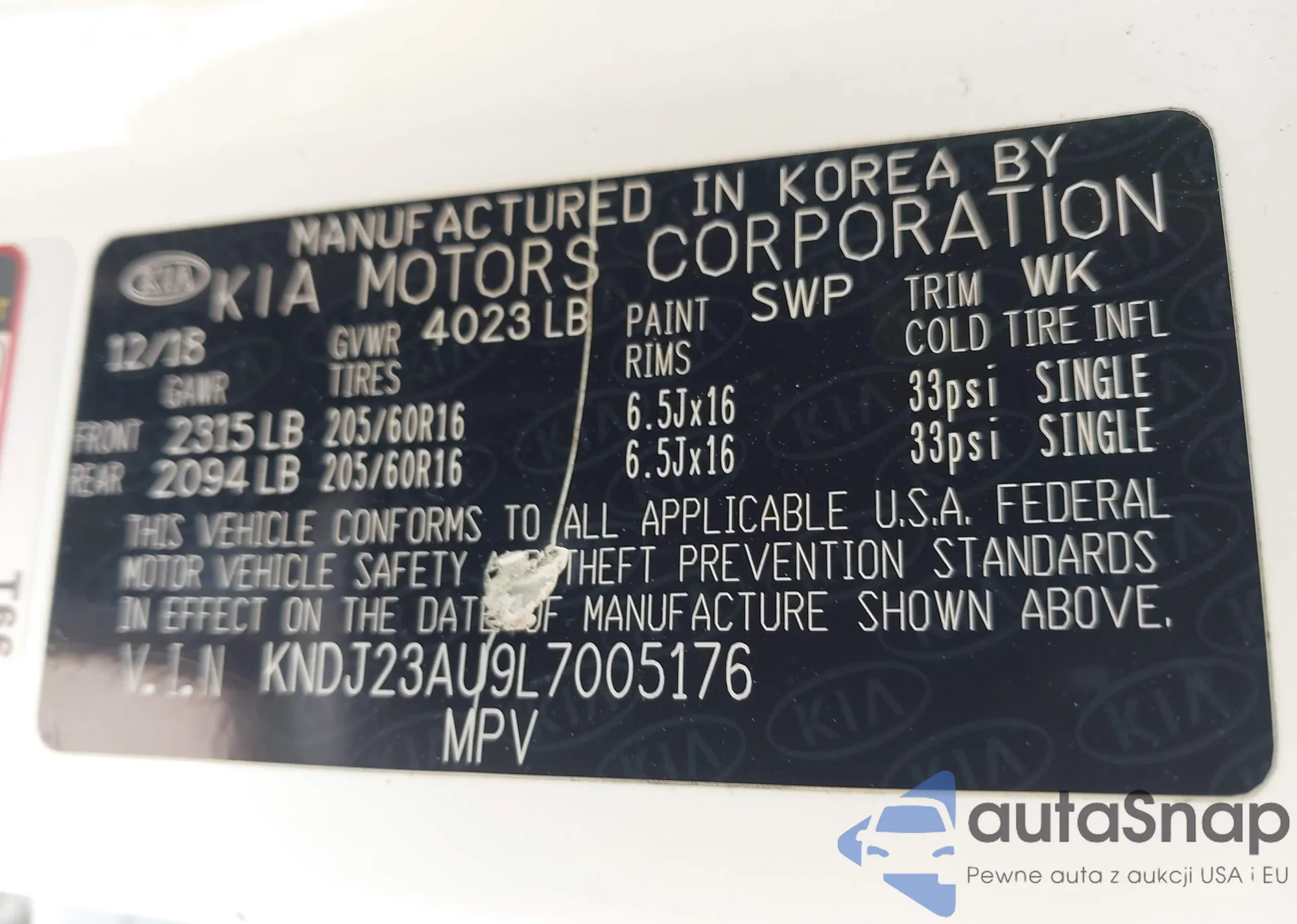 LOT: 43186884 VIN: KNDJ23AU9L7005176