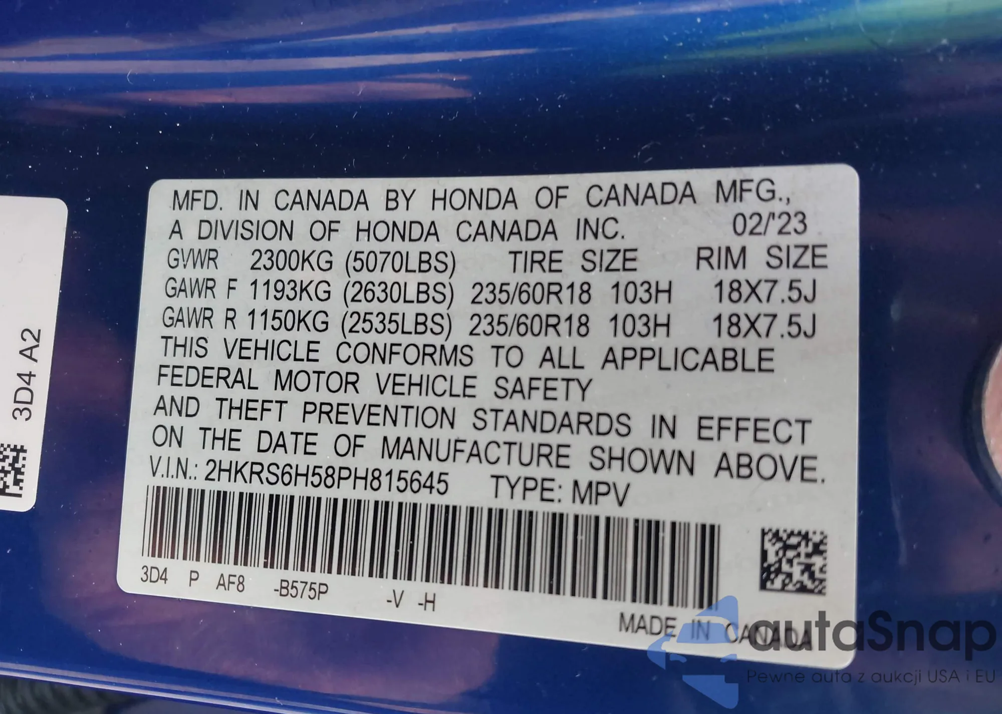 • VIN 5J6RE3H58BL042499