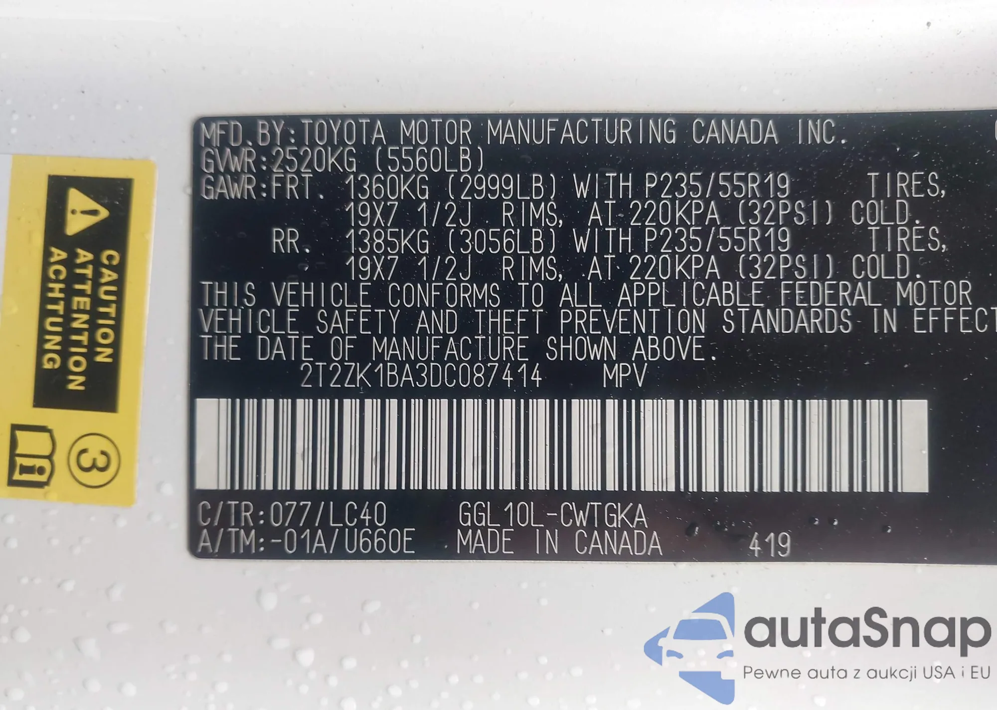 • VIN 2T2ZK1BA3DC087414