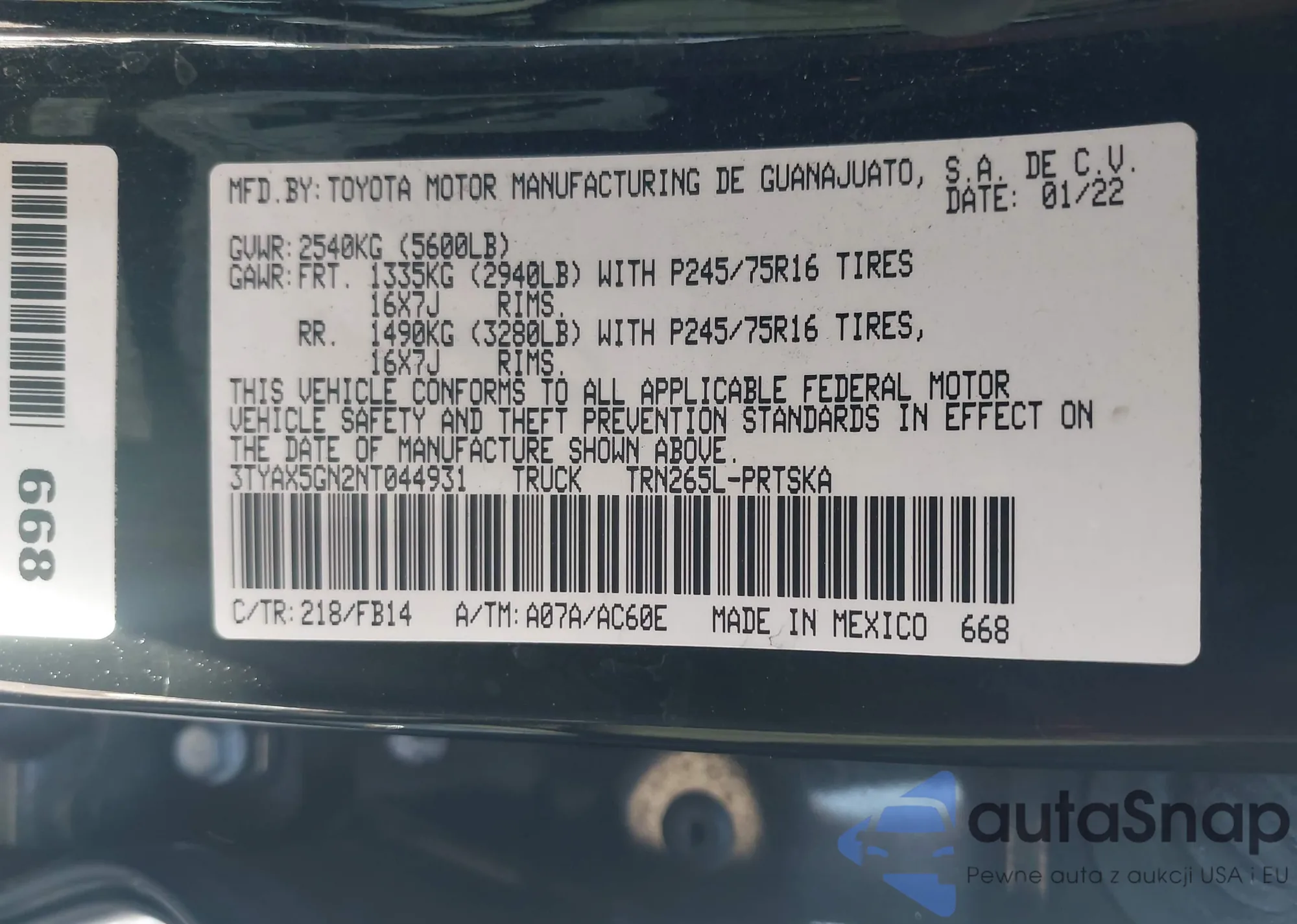 LOT: 43500845 VIN: 3TYAX5GN2NT044931