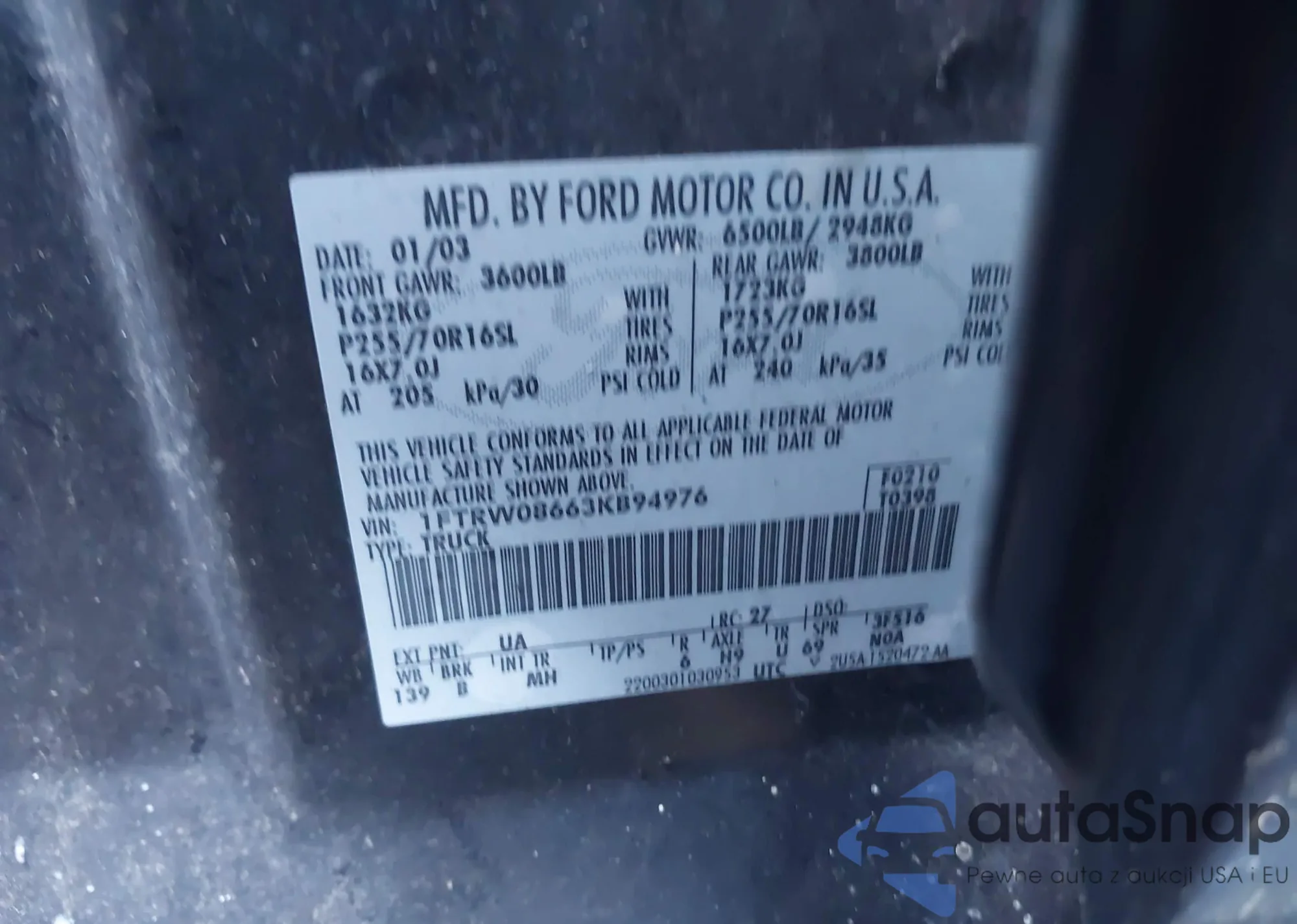 • VIN 1FTRW08663KB94976