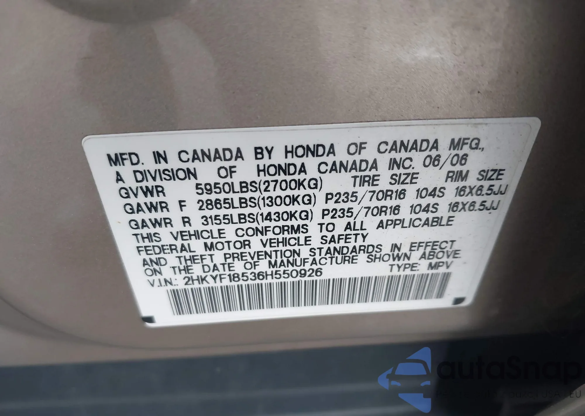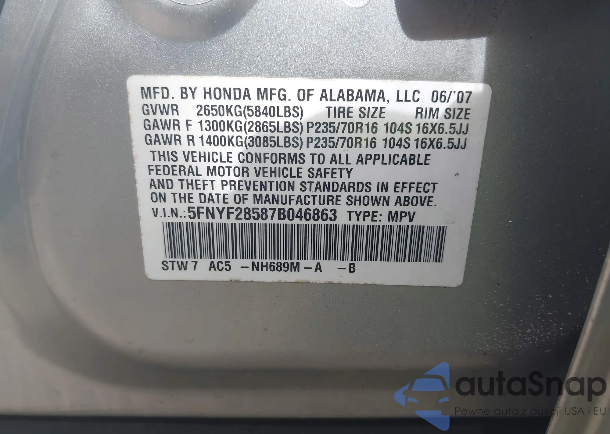 LOT: 43522623 VIN: 5FNYF28587B046863