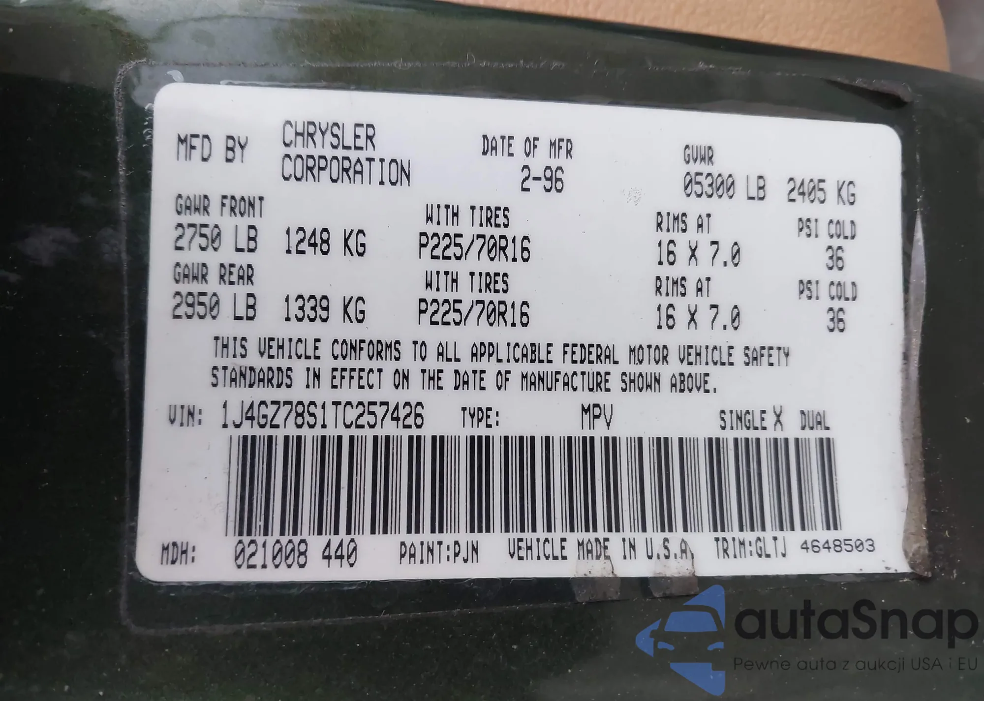 • VIN 1J4GZ78S1TC257426