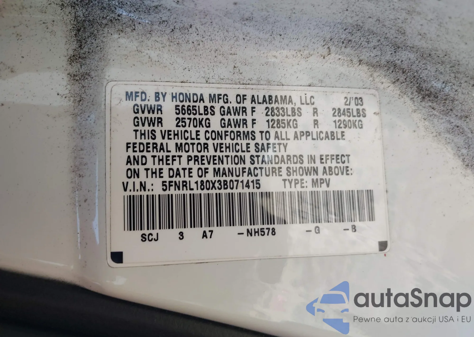 • VIN 5FNRL180X3B071415