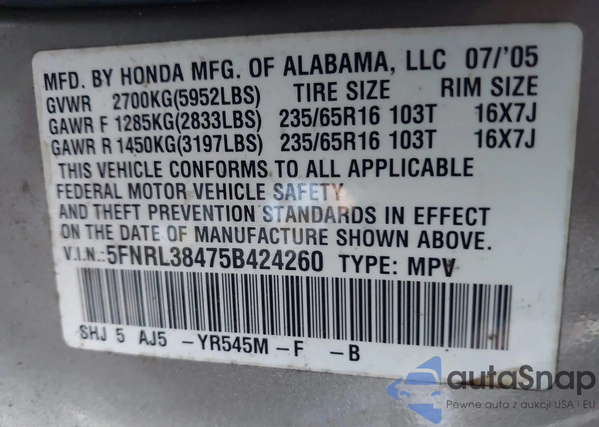 LOT: 43482389 VIN: 5FNRL180X3B071415