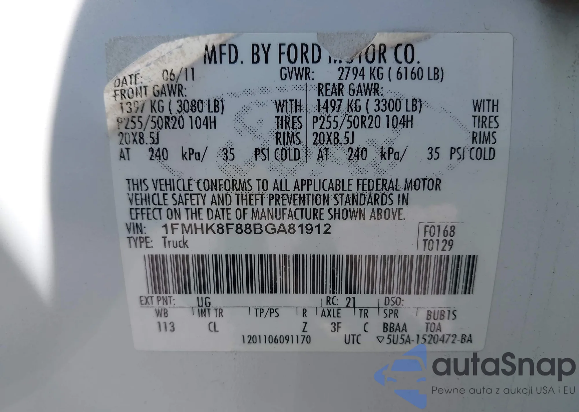 LOT: 43355690 VIN: 1FMHK8F88BGA81912