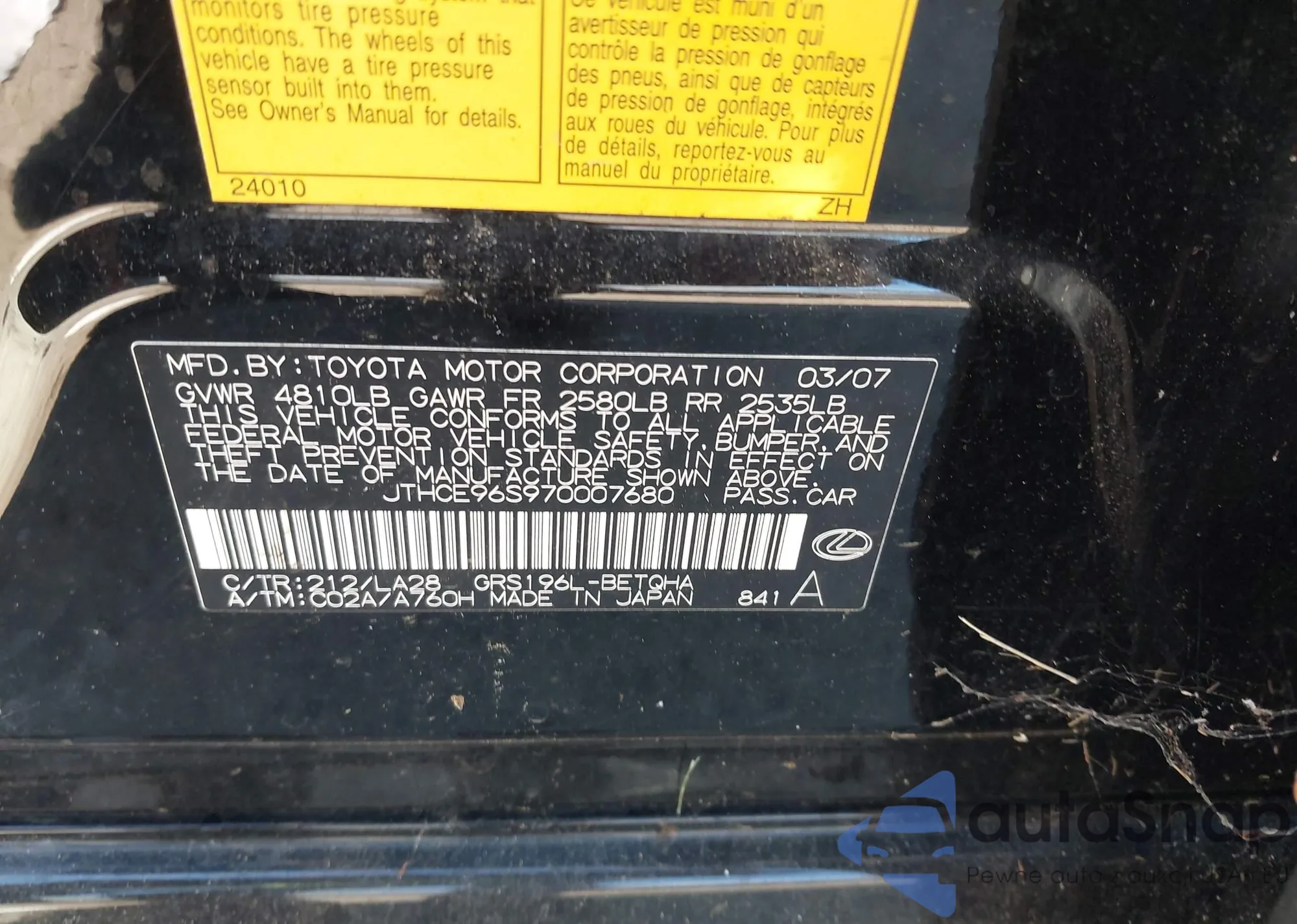 LOT: 43461378 VIN: JTHCE96S970007680