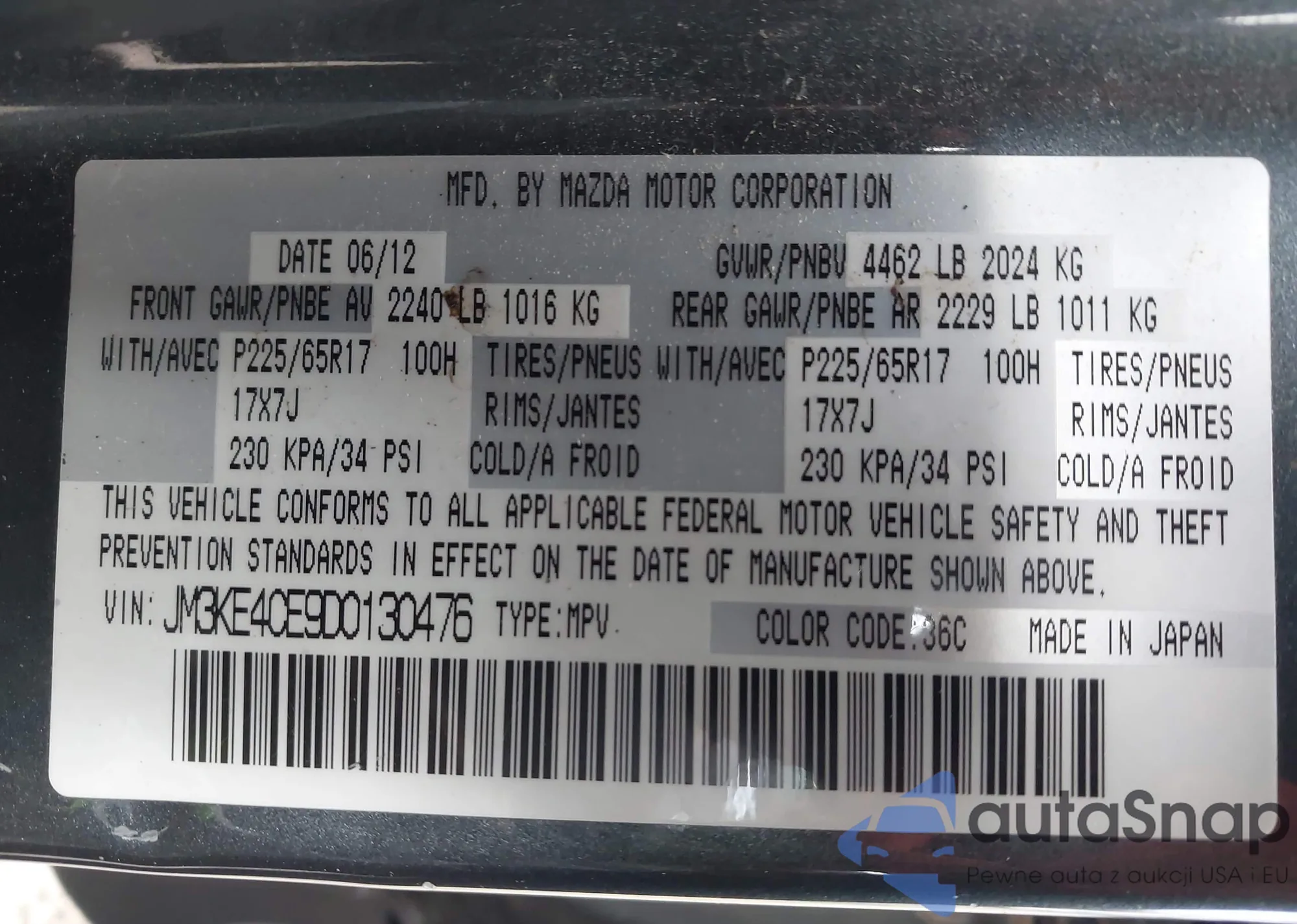 LOT: 43503936 VIN: JM3KE4CE9D0130476