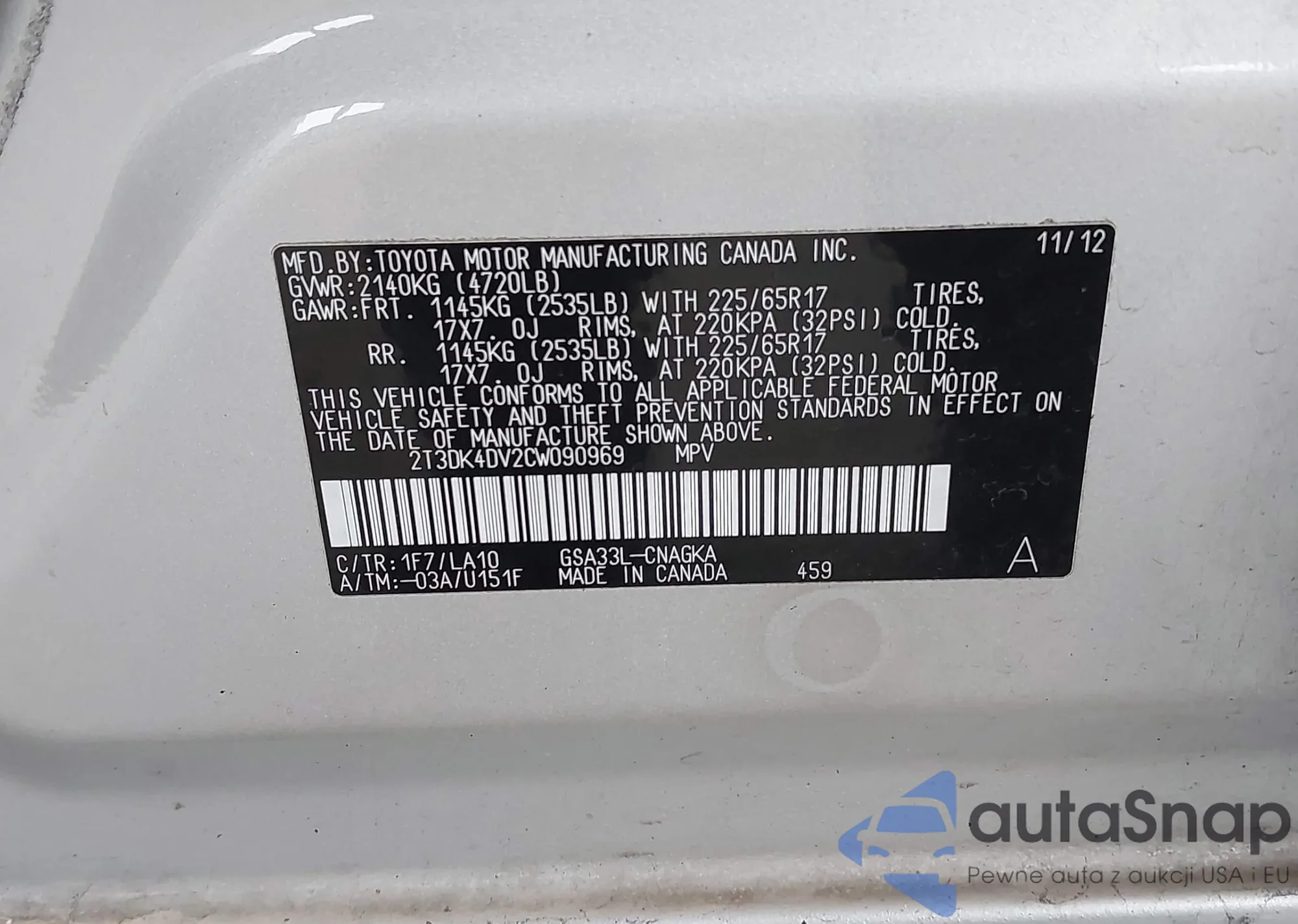 LOT: 43588167 VIN: 2T3DK4DV2CW090969