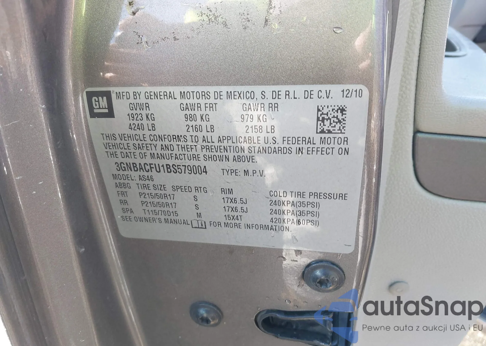 LOT: 43616063 VIN: 3GNBACFU1BS579004