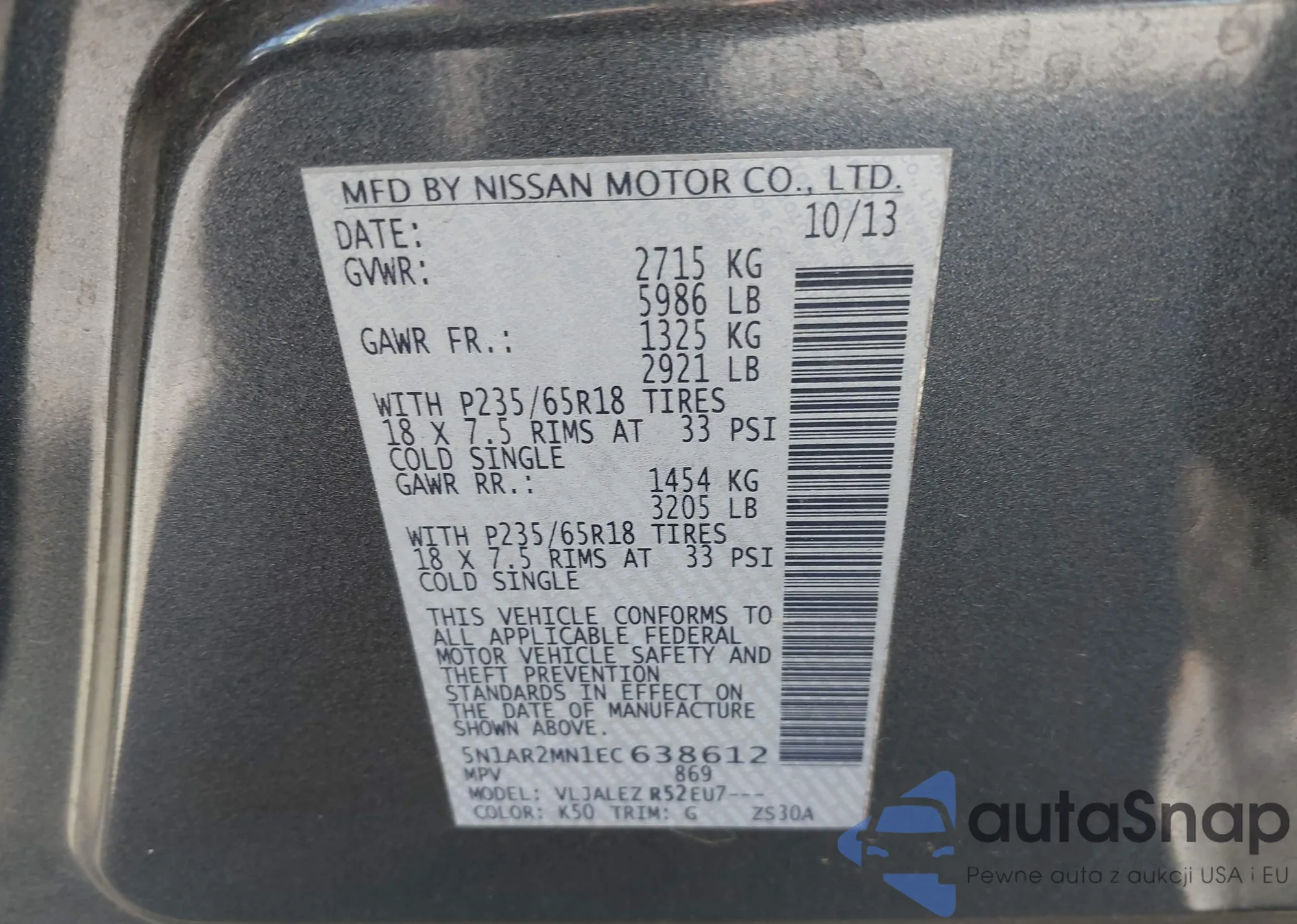 LOT: 43666885 VIN: 5N1AR2MN1EC638612