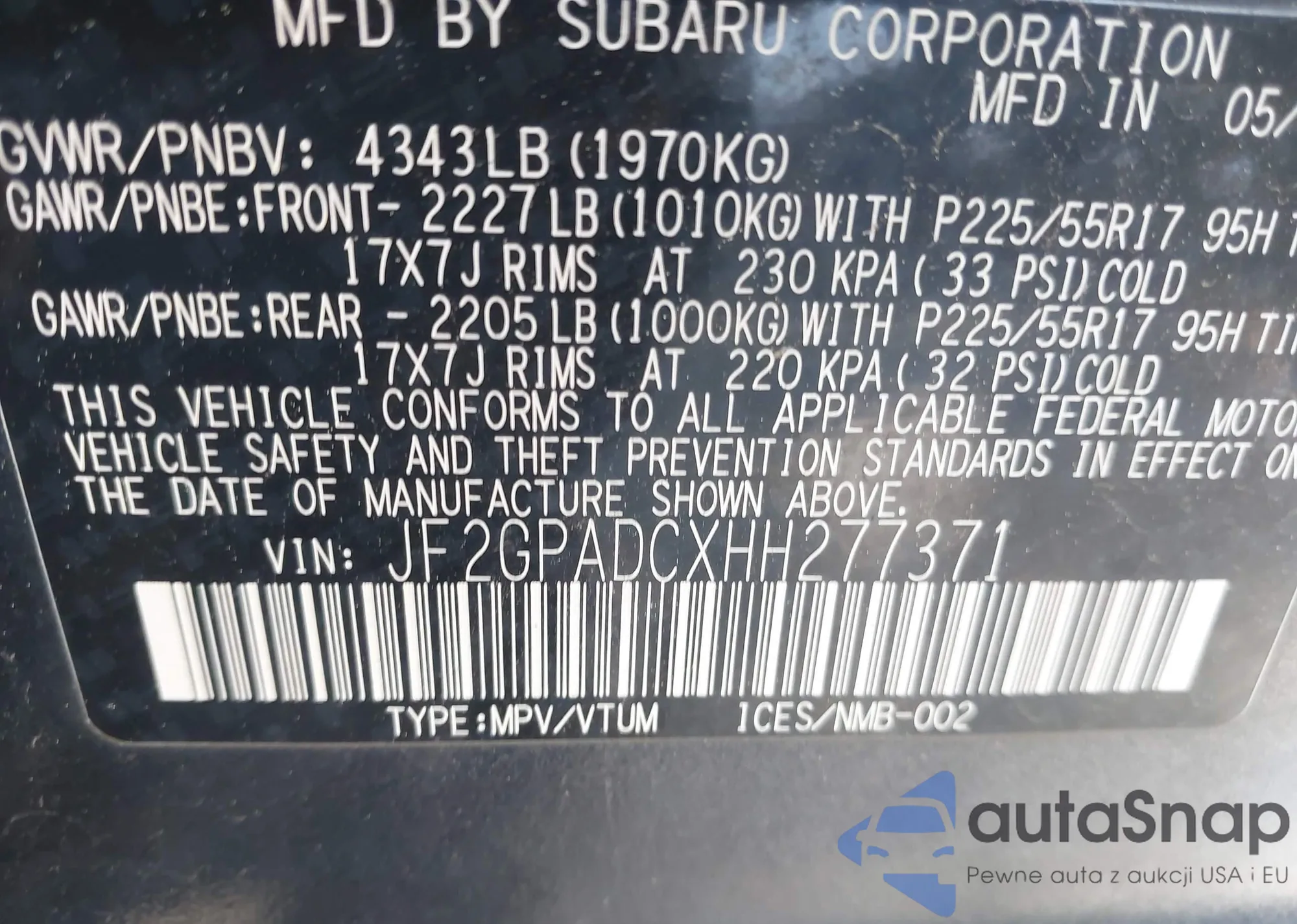 • VIN JF2GPADCXHH277371