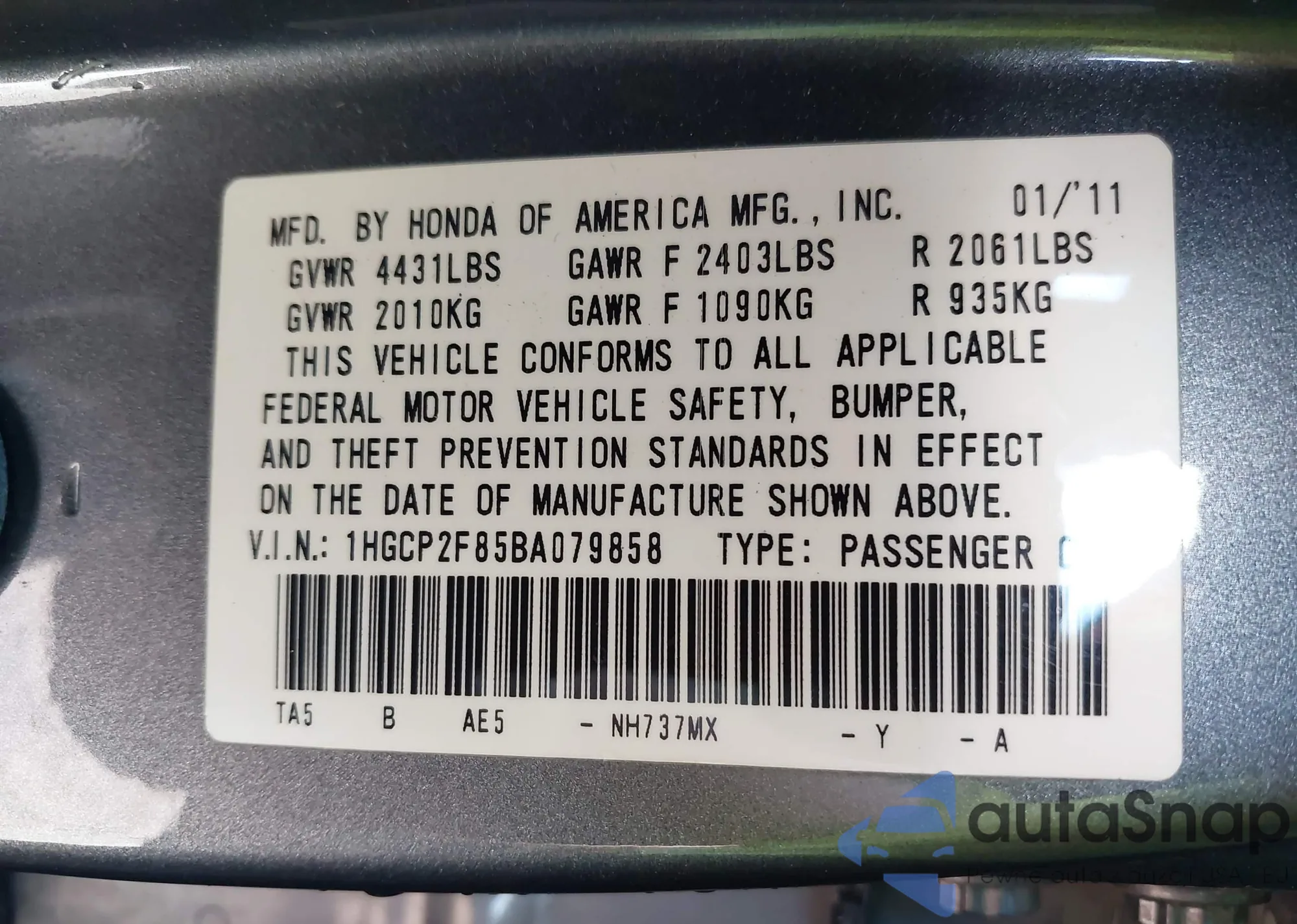• VIN 1HGCP2F85BA079858