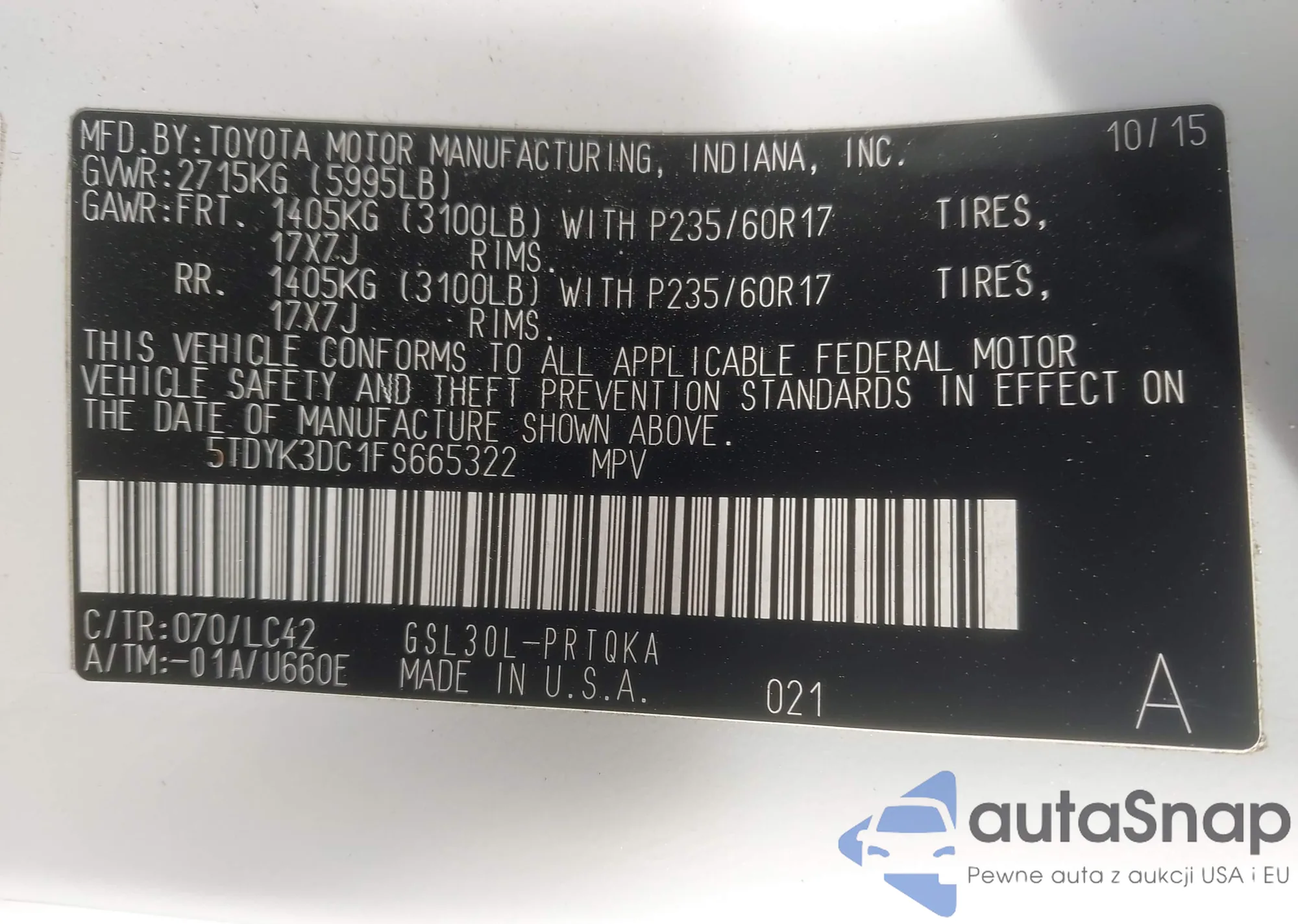 LOT: 43535765 VIN: 5TDYK3DC1FS665322