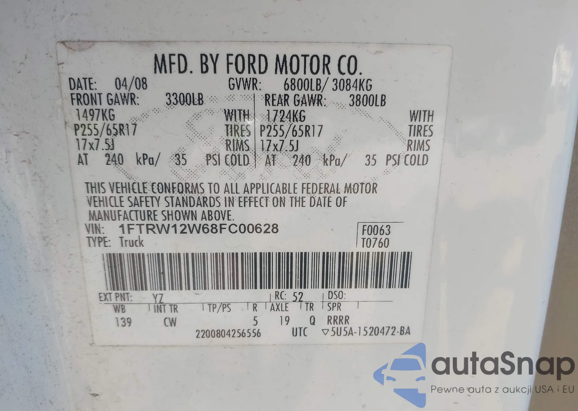 LOT: 43252449 VIN: 1FT7W2BT1HEB13714