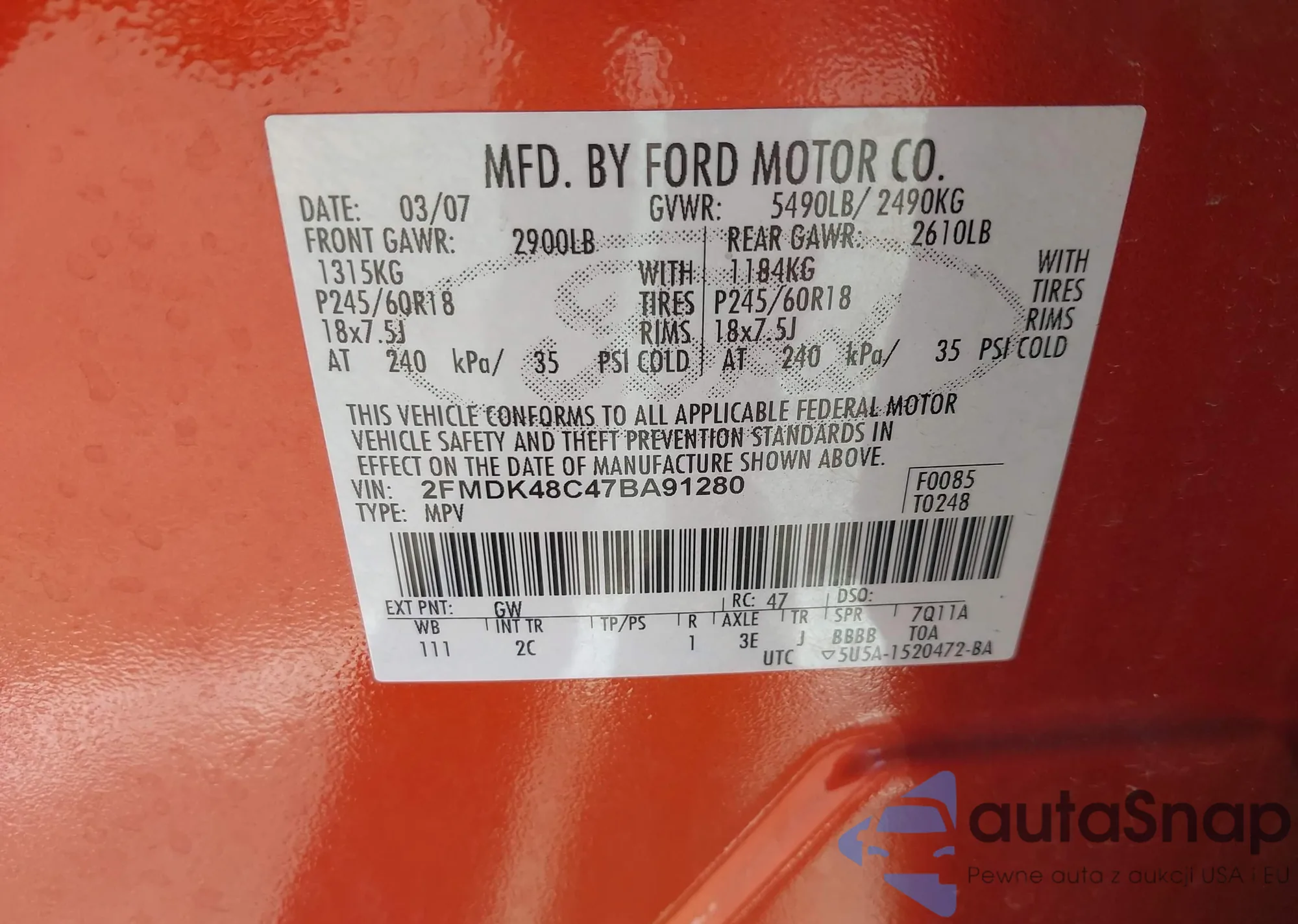 • VIN 2FMDK48C47BA91280
