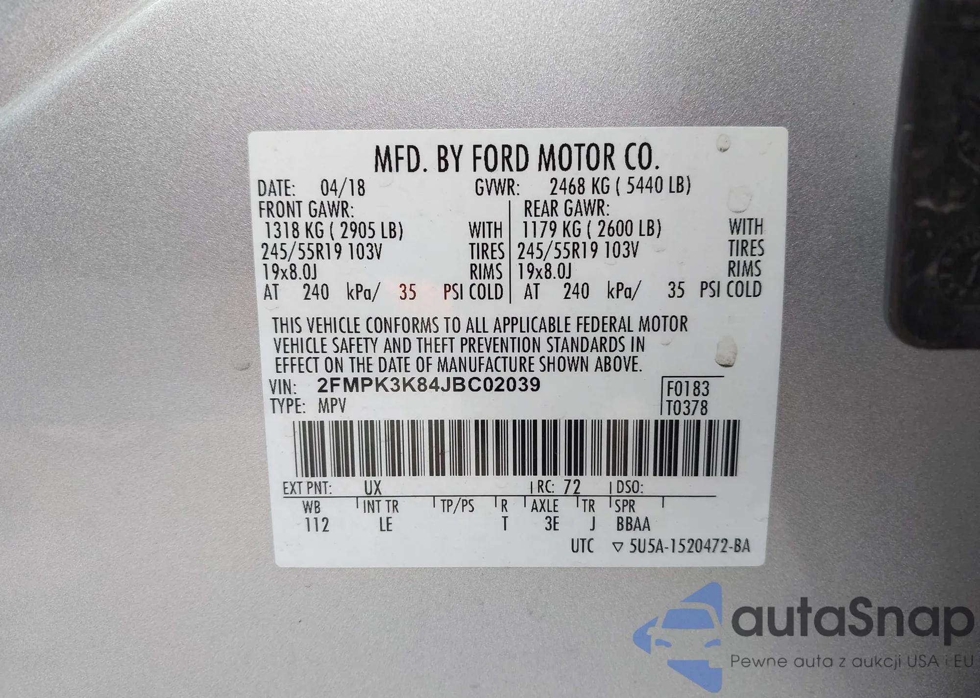LOT: 43511520 VIN: 2FMPK3K84JBC02039