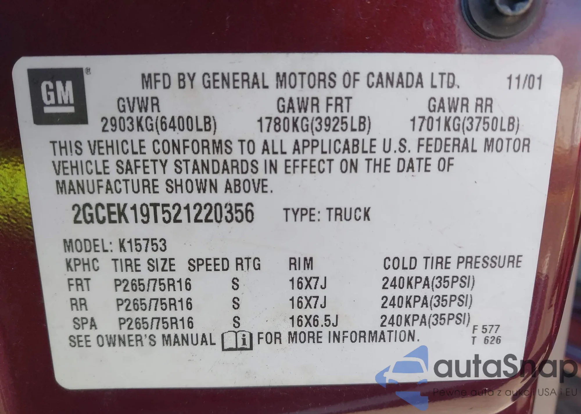 LOT: 43582986 VIN: 2GCEK19T521220356
