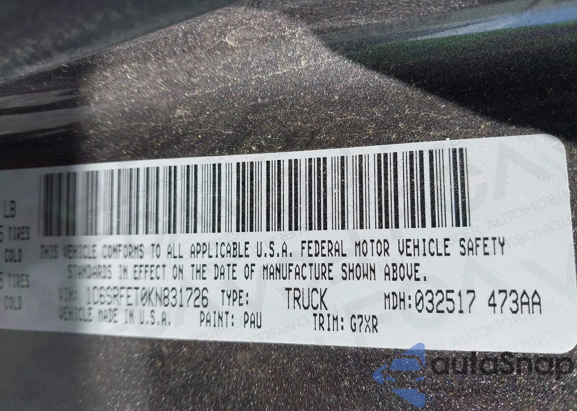 LOT: 43646288 VIN: 1C6SRFET0KN831726
