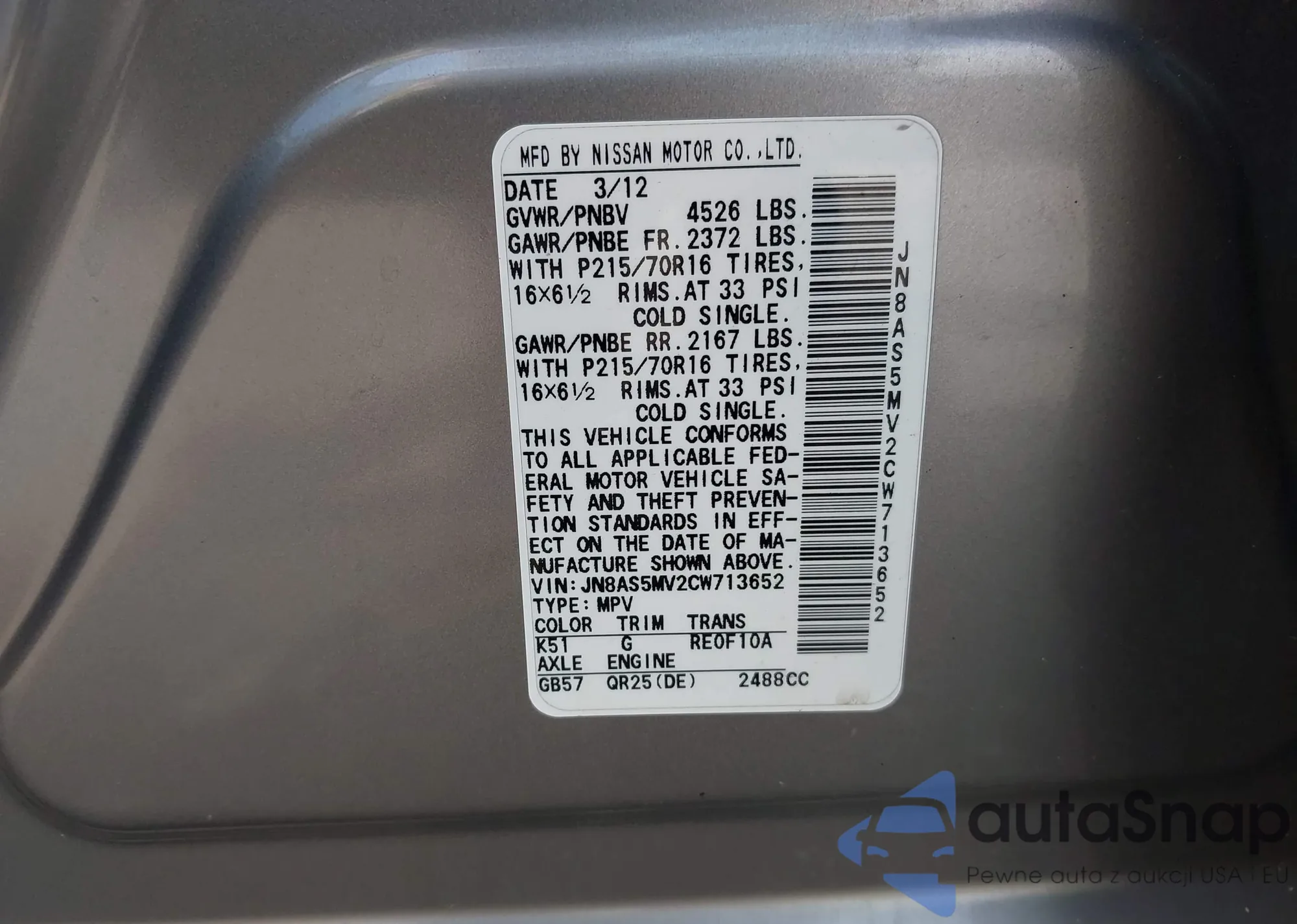 LOT: 43664932 VIN: JN8AF5MV7DT229175