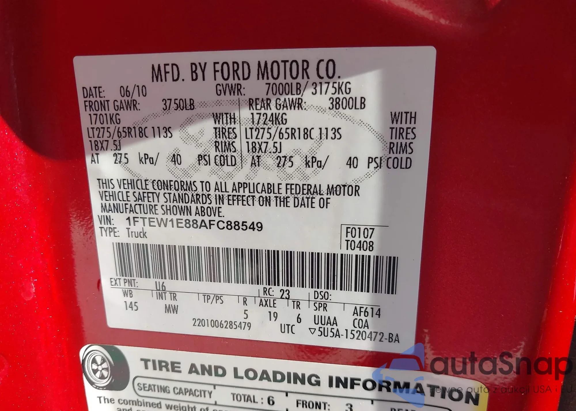 • VIN 1FTEW1E88AFC88549