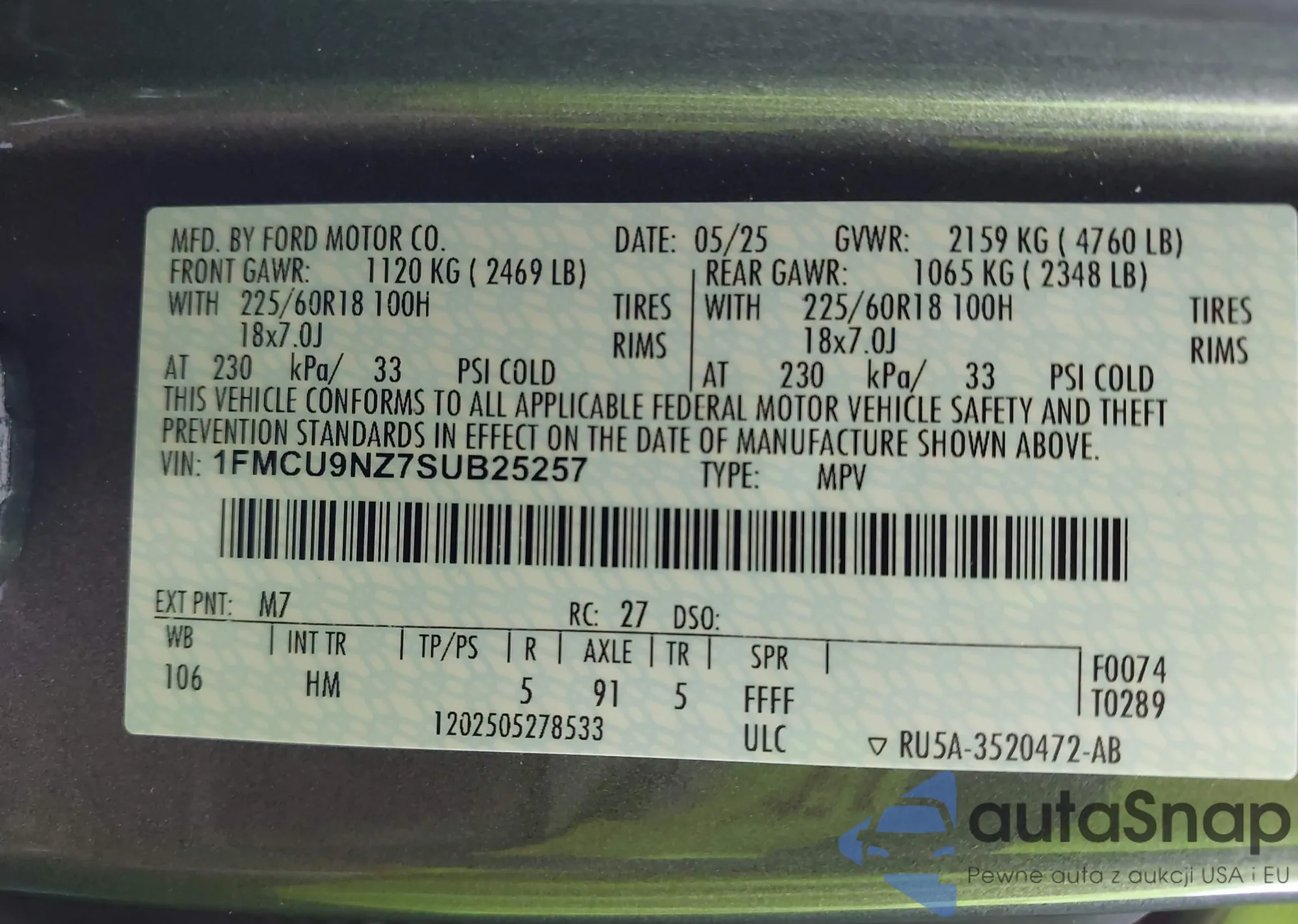 • VIN 1FMCU9NZ7SUB25257