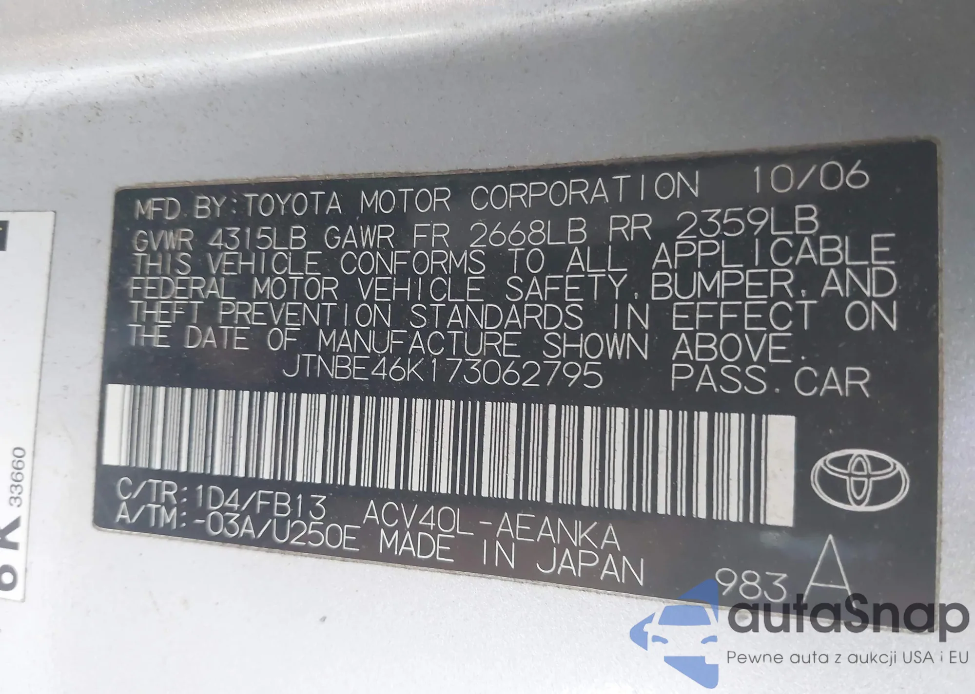 LOT: 43511318 VIN: JTNBE46K173062795