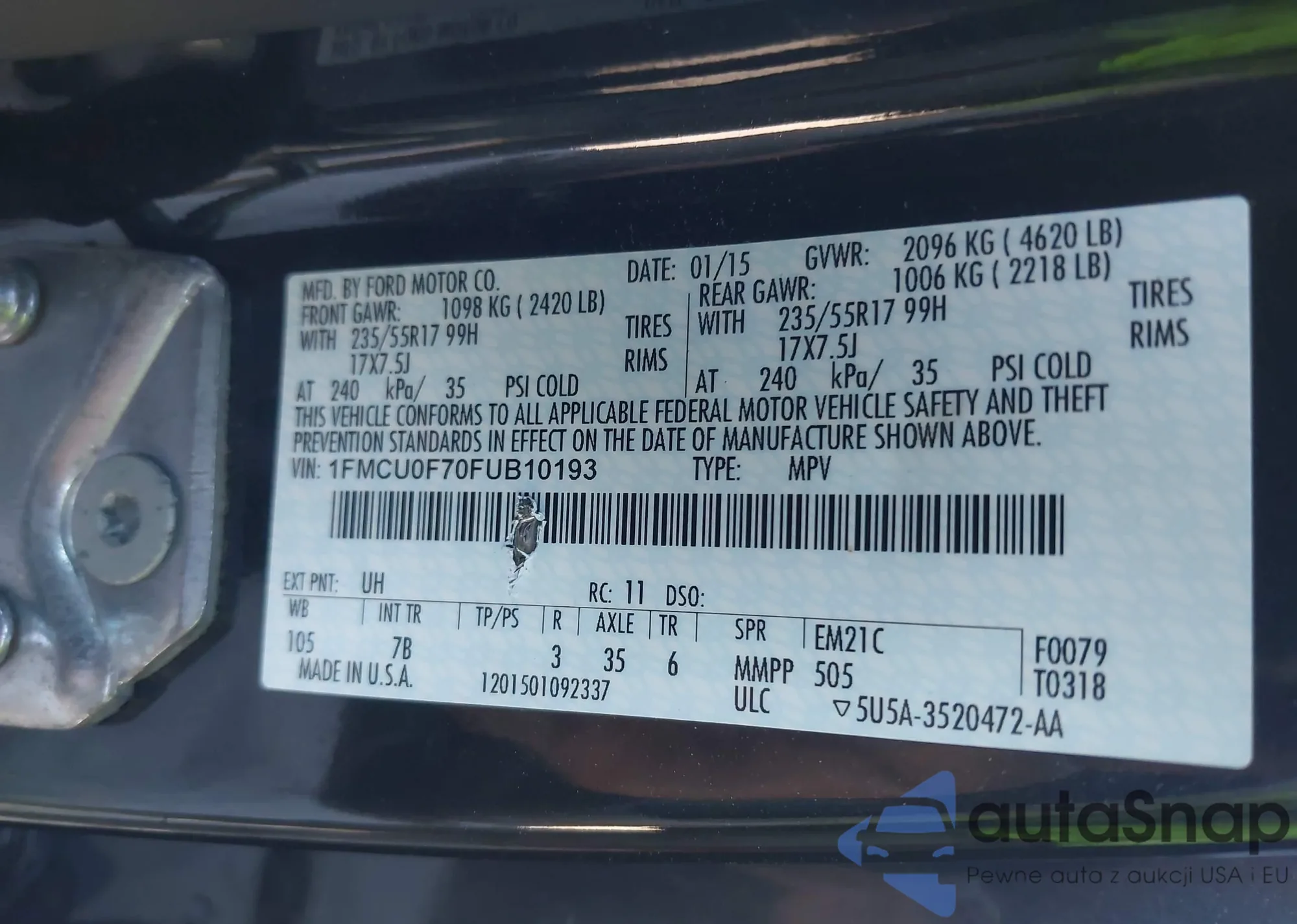 LOT: 43467425 VIN: 1FMCU0F70FUB10193