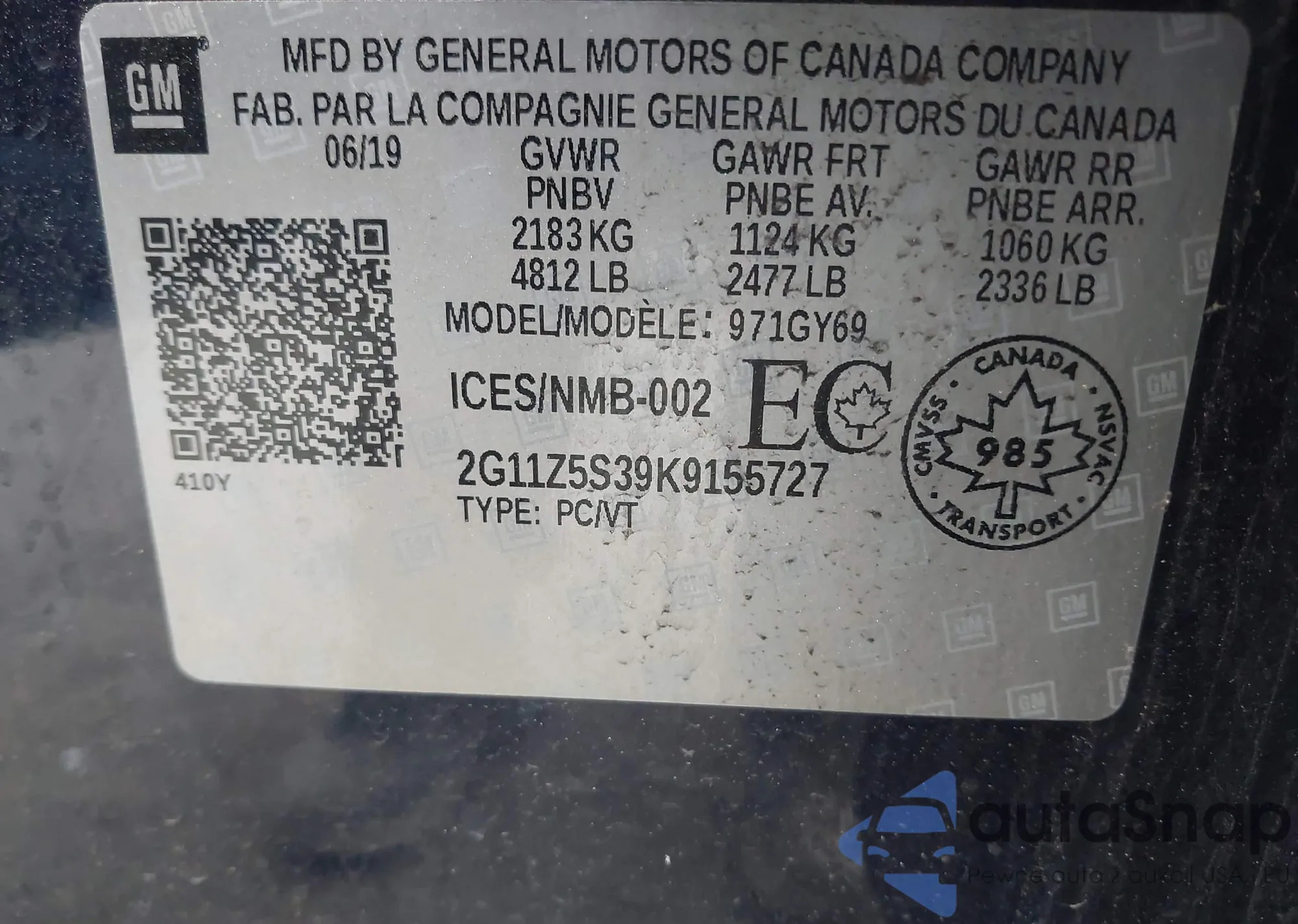 • VIN 2G11Z5S39K9155727
