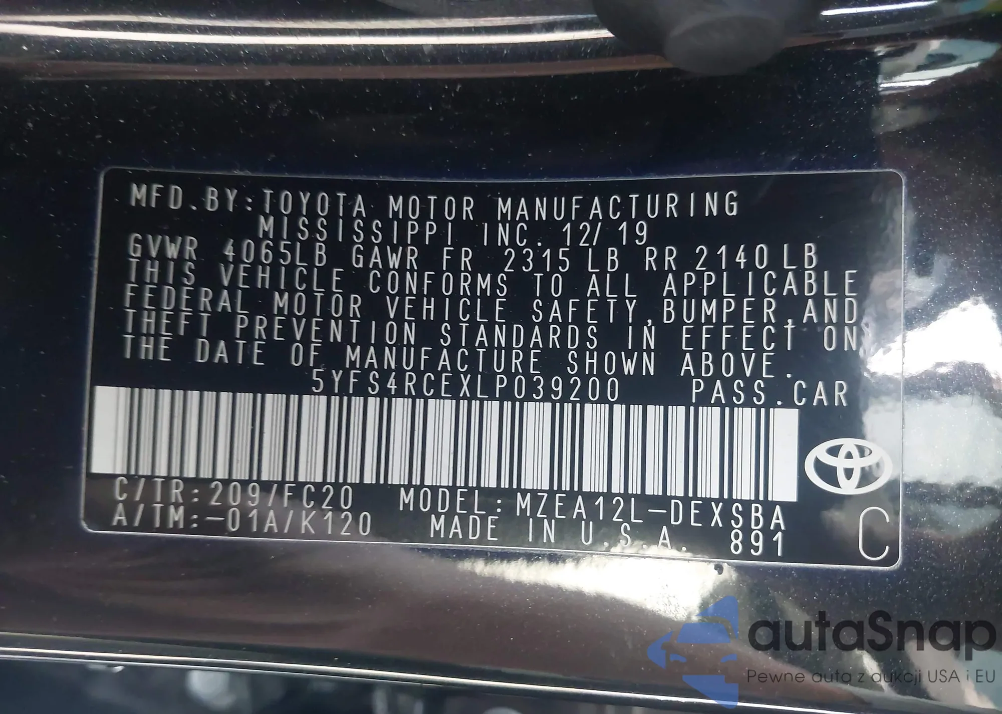 LOT: 43677535 VIN: 5YFS4RCEXLP039200