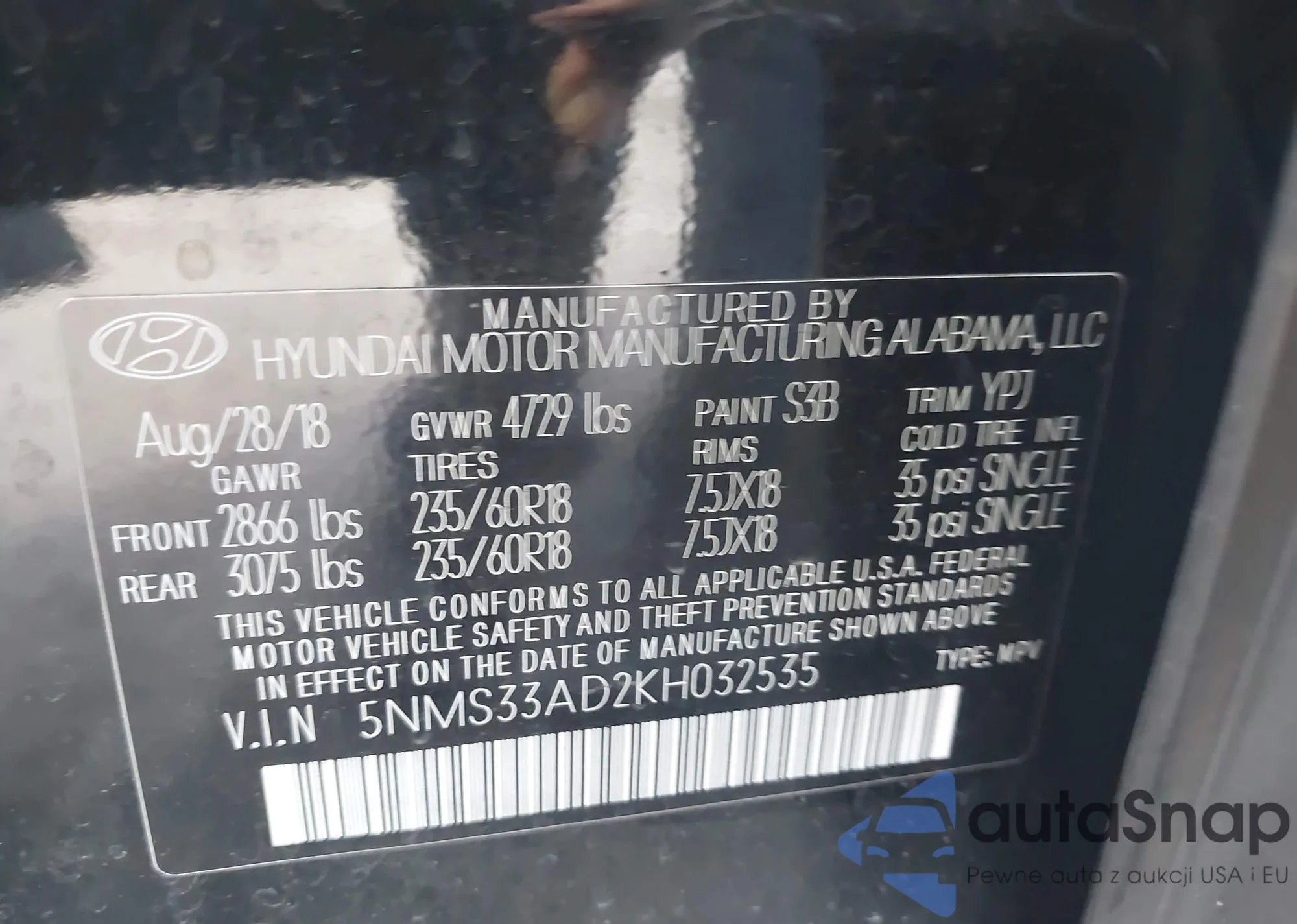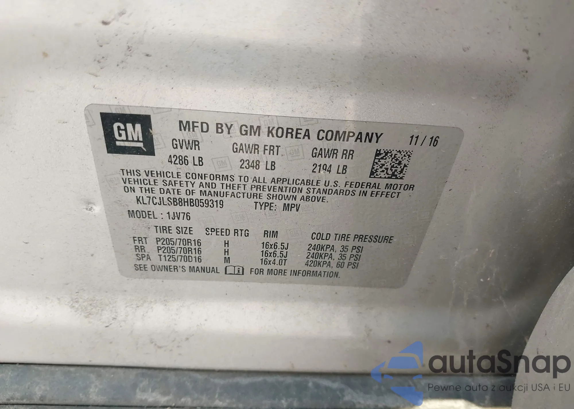 • VIN KL7CJLSB8HB059319