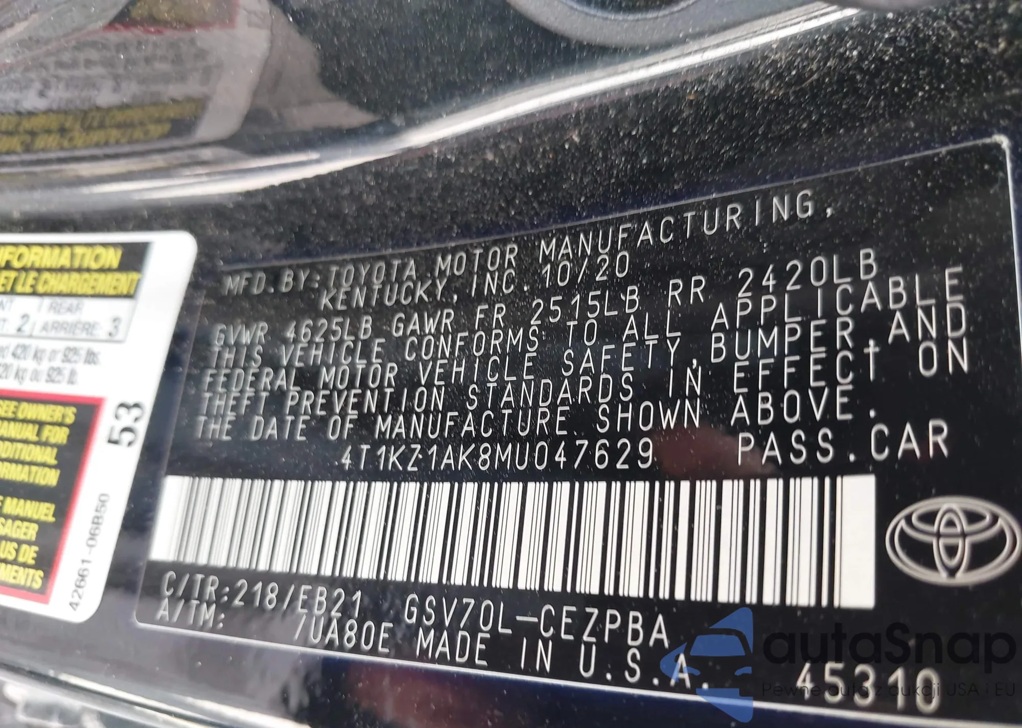 • VIN 4T1KZ1AK8MU047629