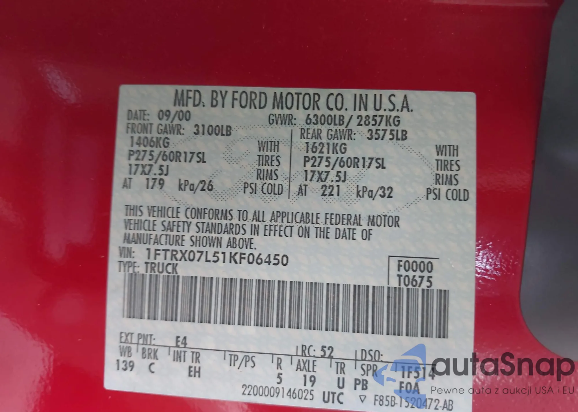 LOT: 43507883 VIN: 1FTRX07L51KF06450