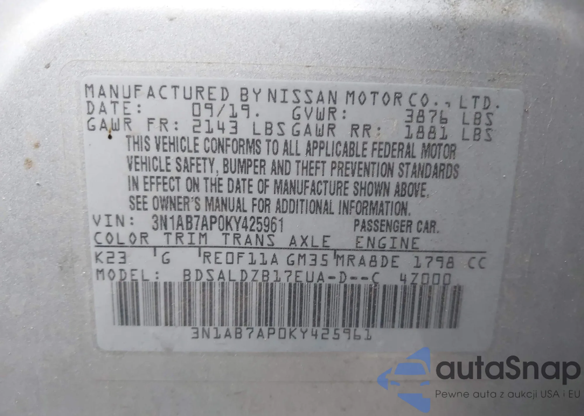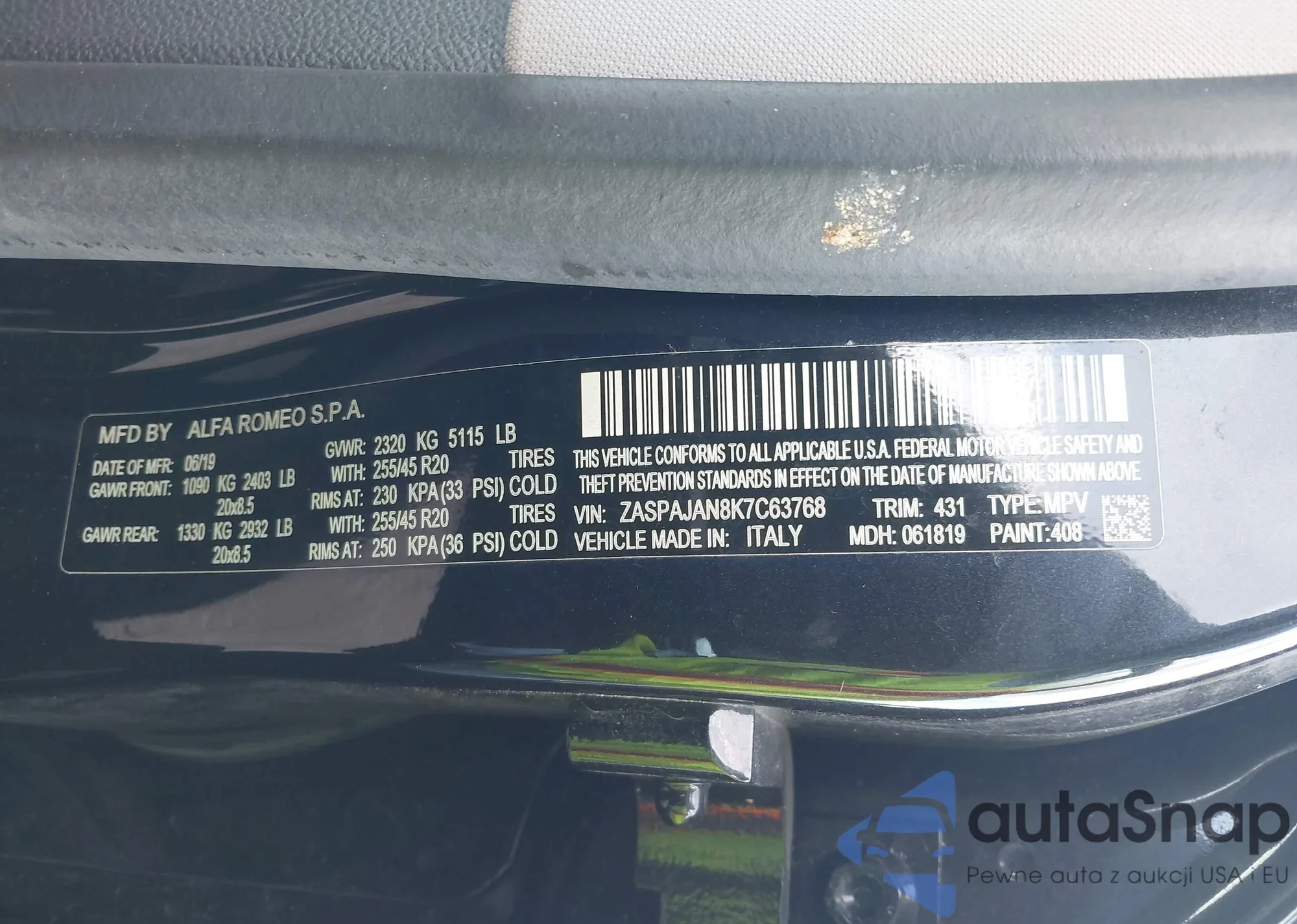 LOT: 43536605 VIN: ZASPAJAN8K7C63768