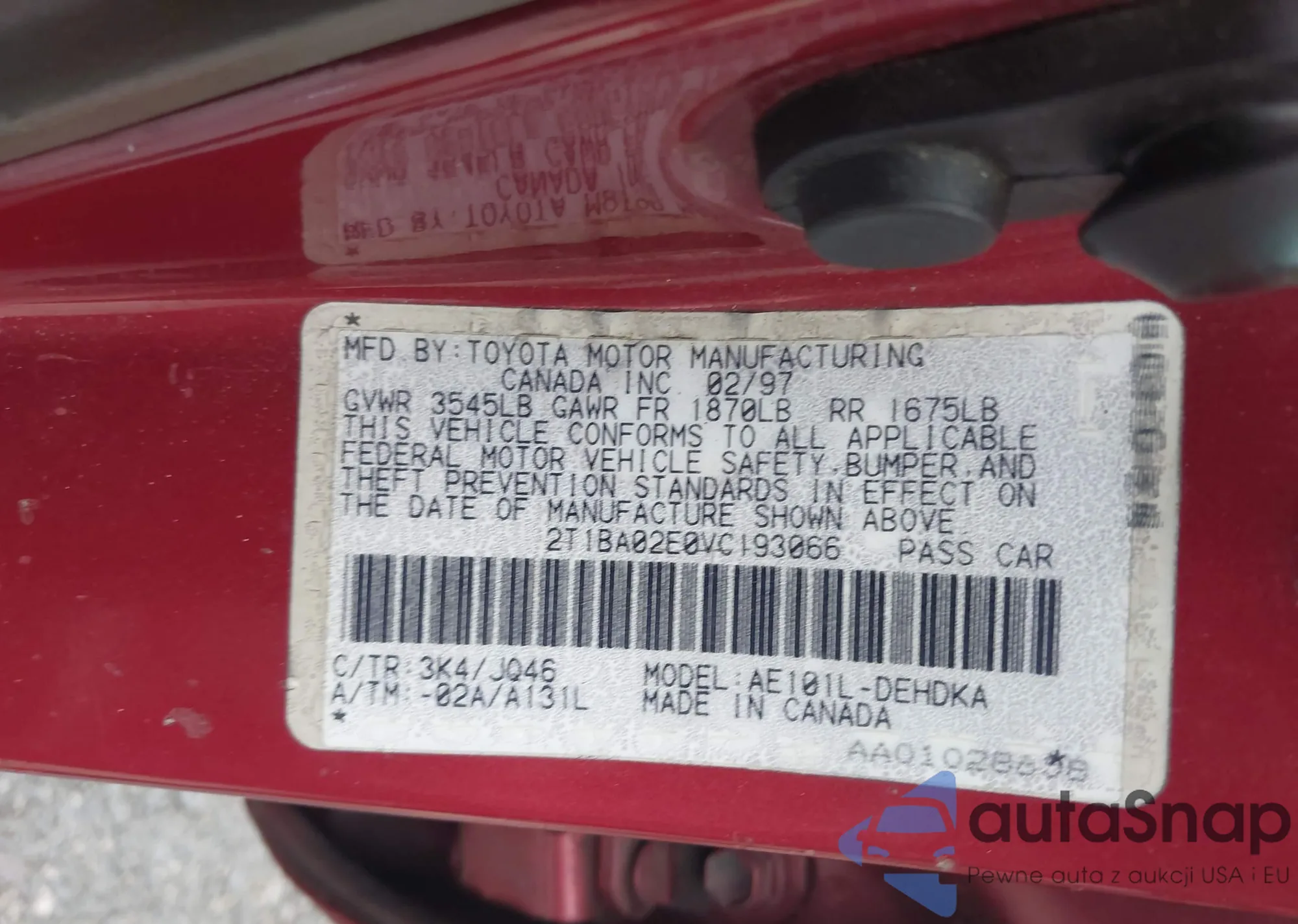 1997 Toyota Corolla Ce z USA, uszkodzony, nr VIN 2T1BA02E0VC193066